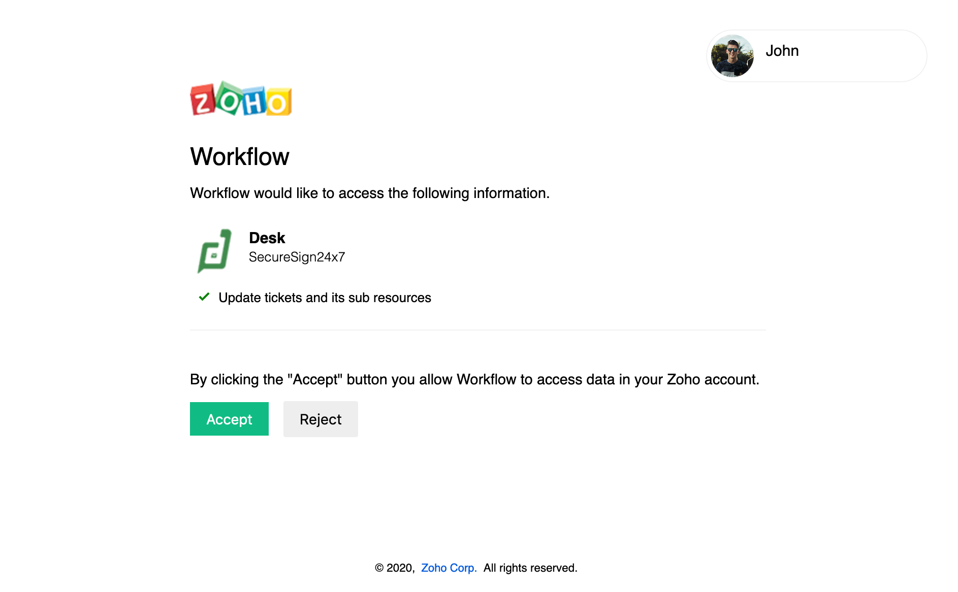 10. Zoho Desk へのアクセスを許可するかどうかを尋ねるポップアップが表示されます。 「承認」をクリックしてください。