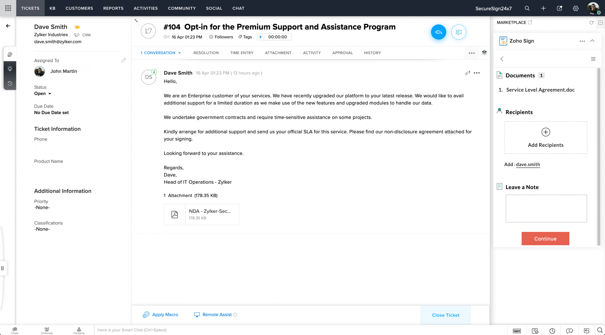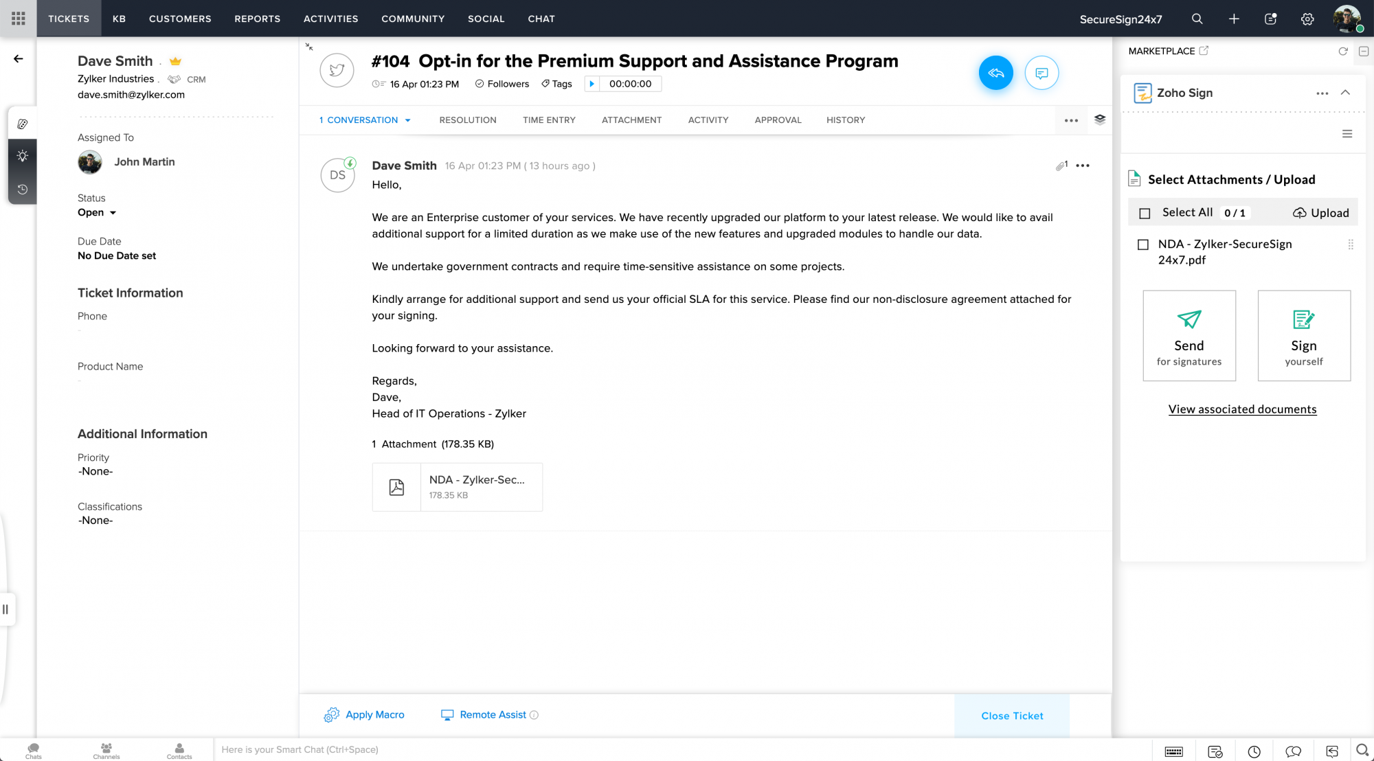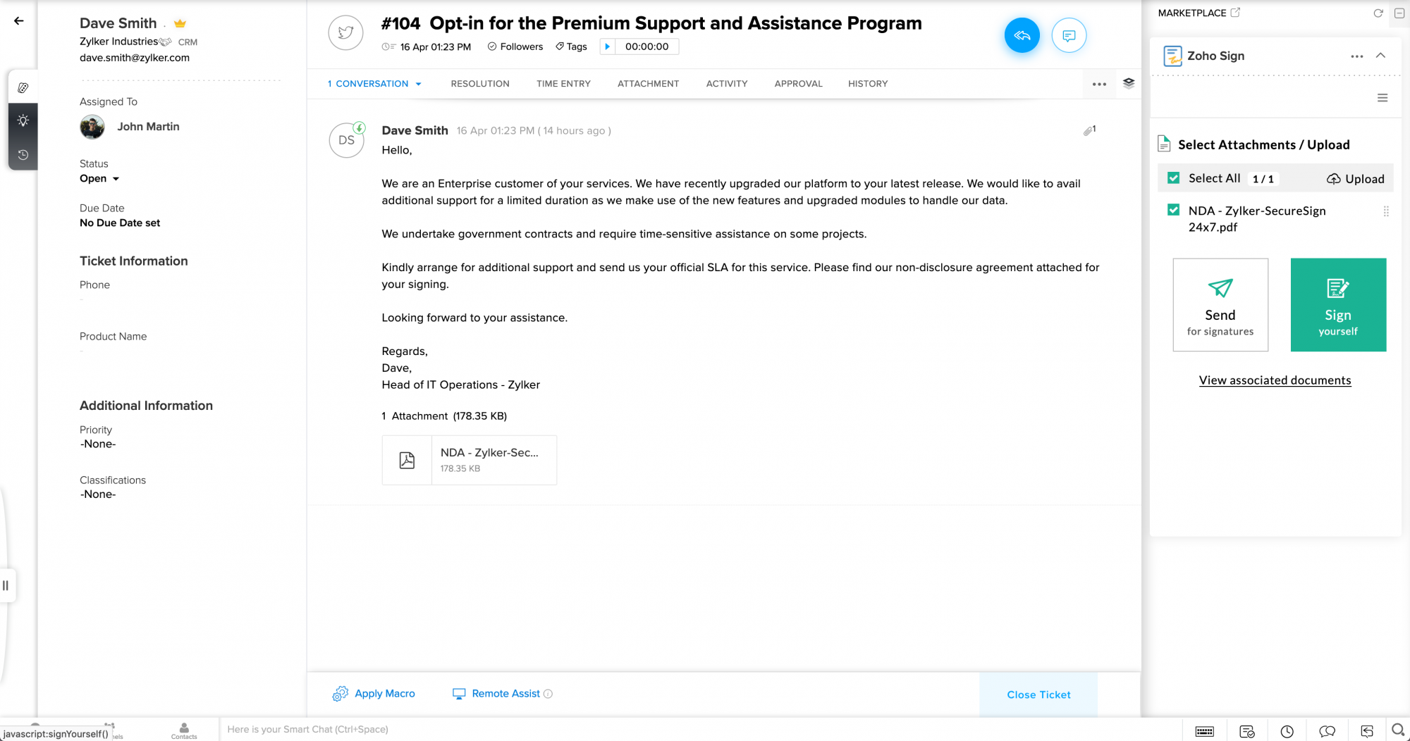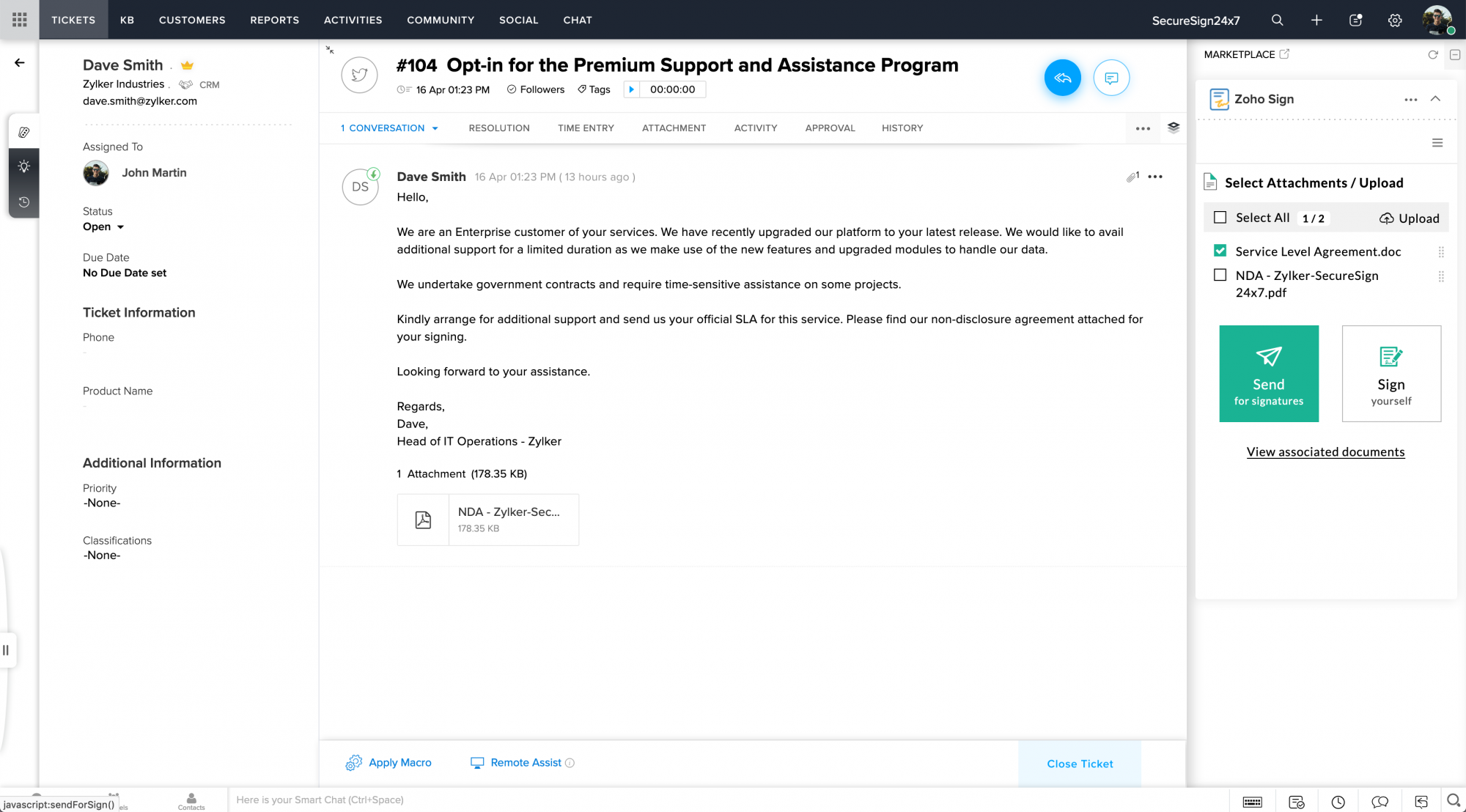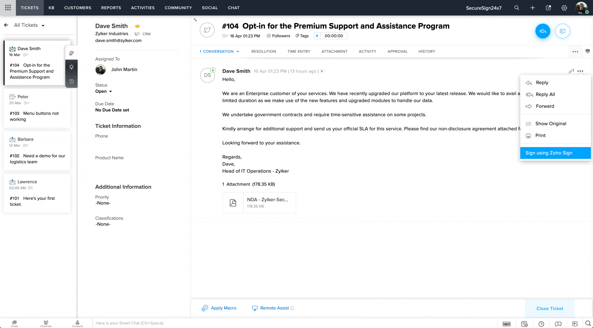 チケットを表示している場合は、「さらに実行」ドロップダウンをクリックして、Zoho Signを使用してサインを選択してください。