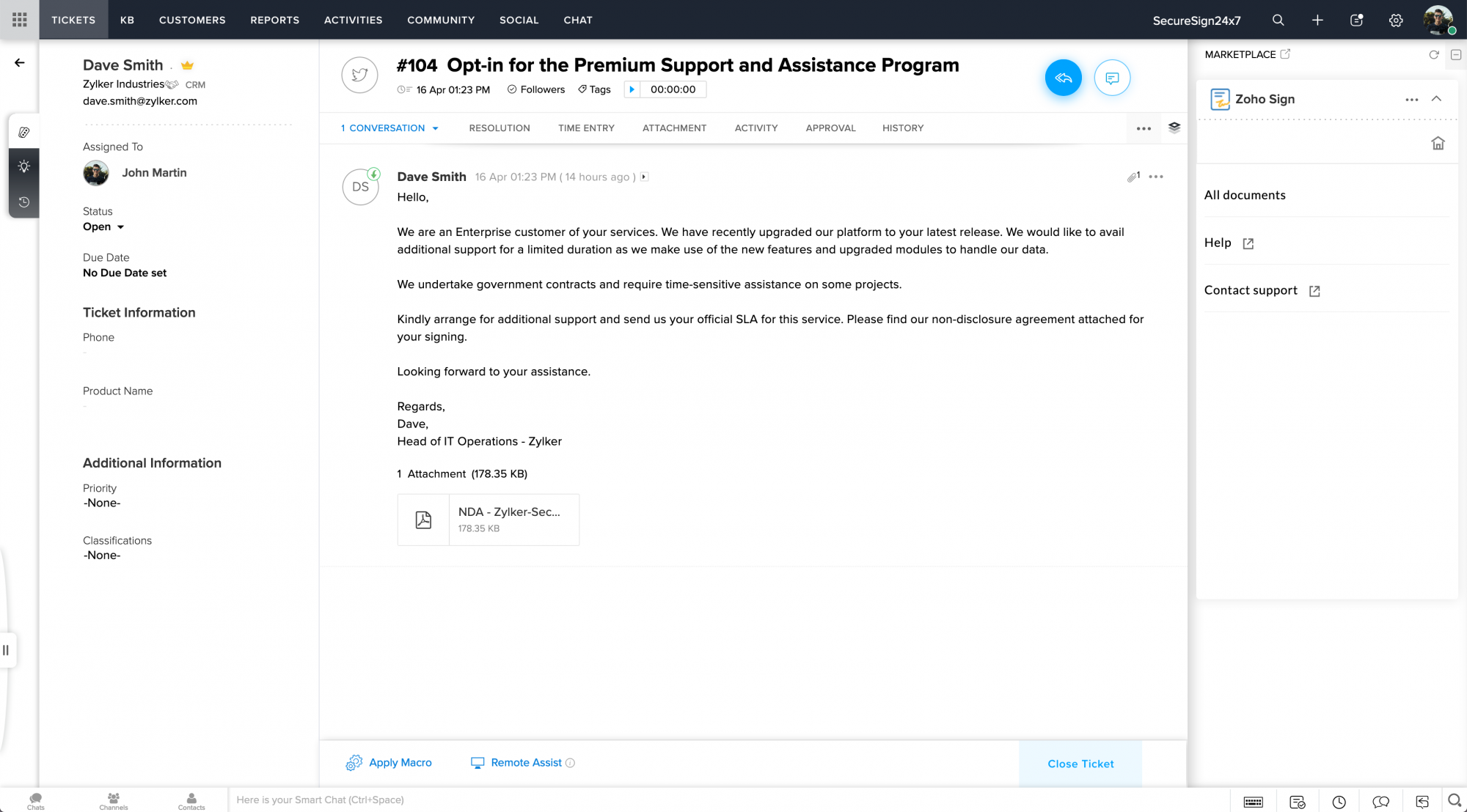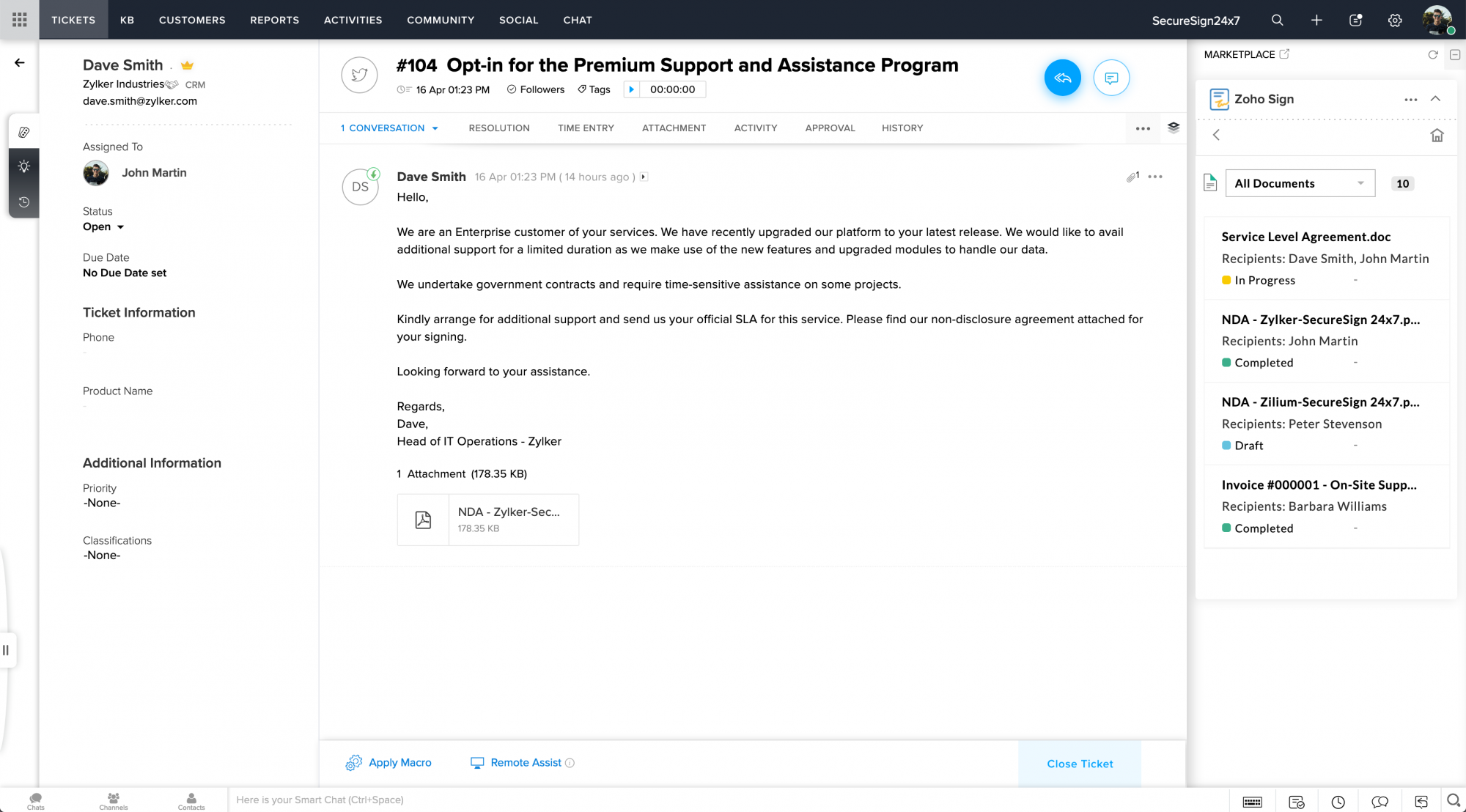 4. ドキュメントの署名が成功した場合、ドキュメントと署名者の詳細を含むコメントがチケットスレッドに自動的に追加されます。