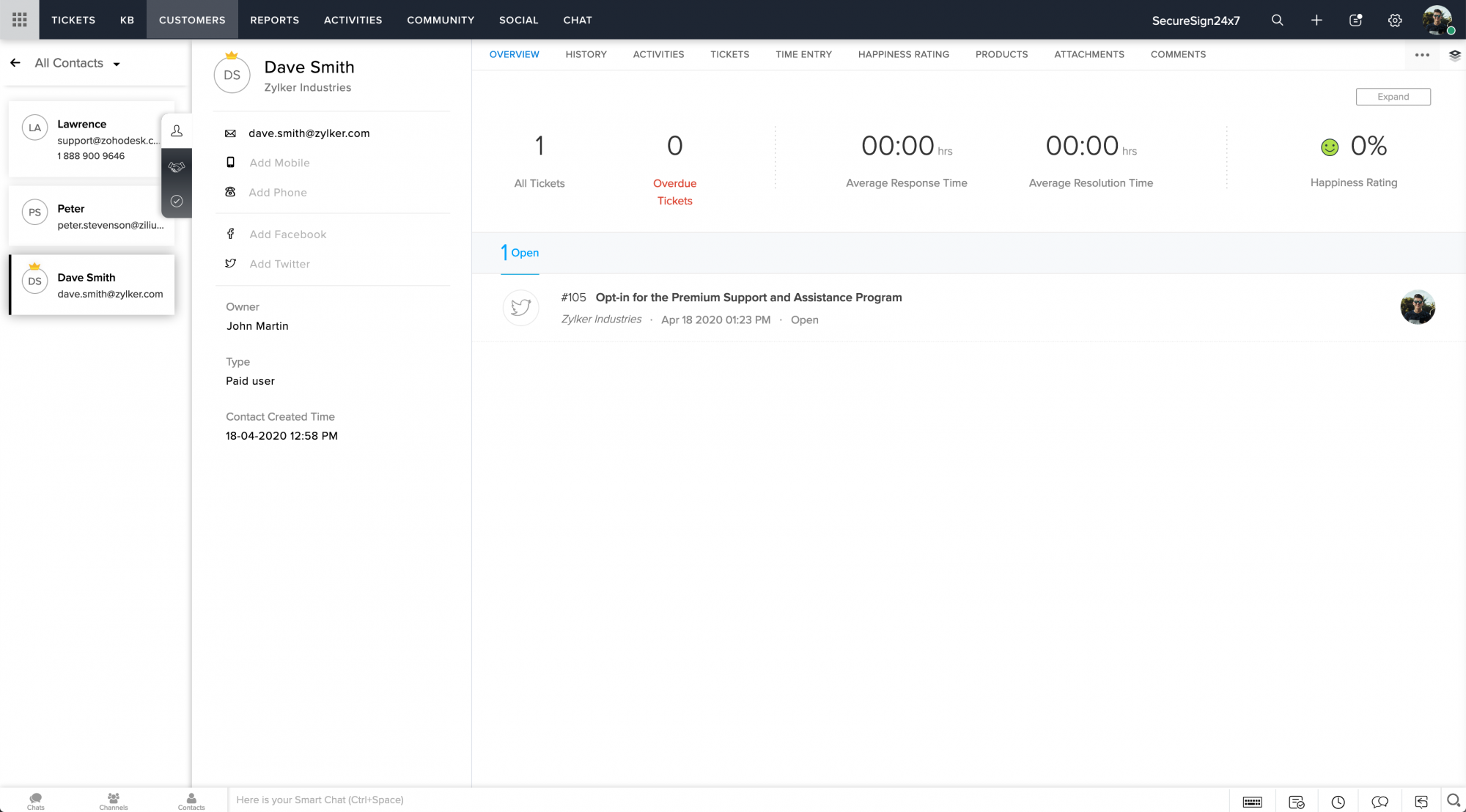 1. チケットまたは連絡先を閲覧している間に、Zoho Sign拡張機能を開きます。