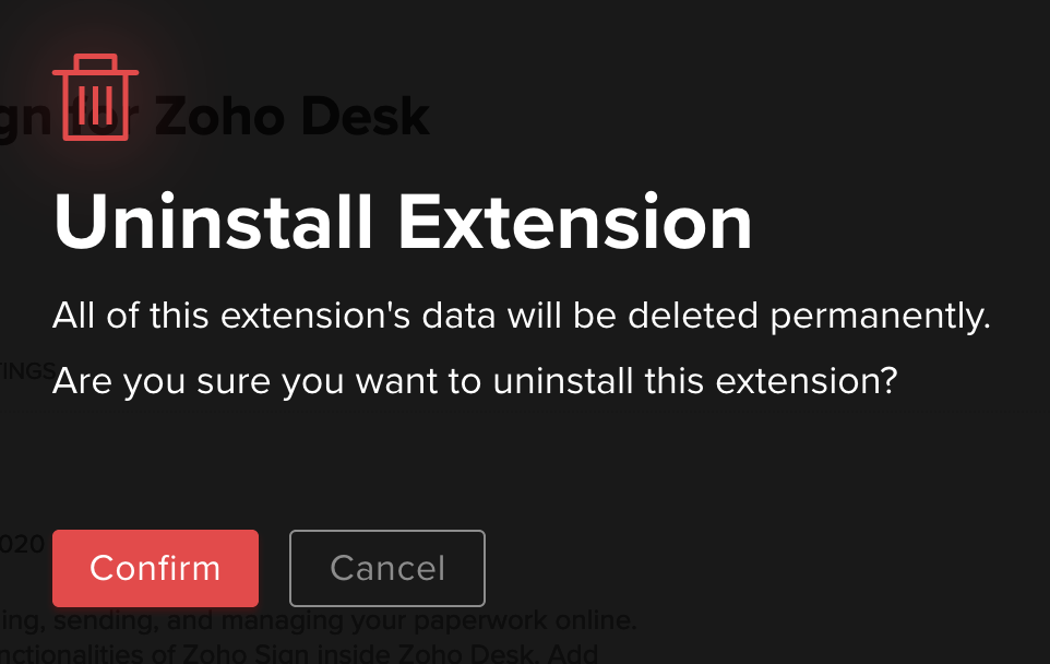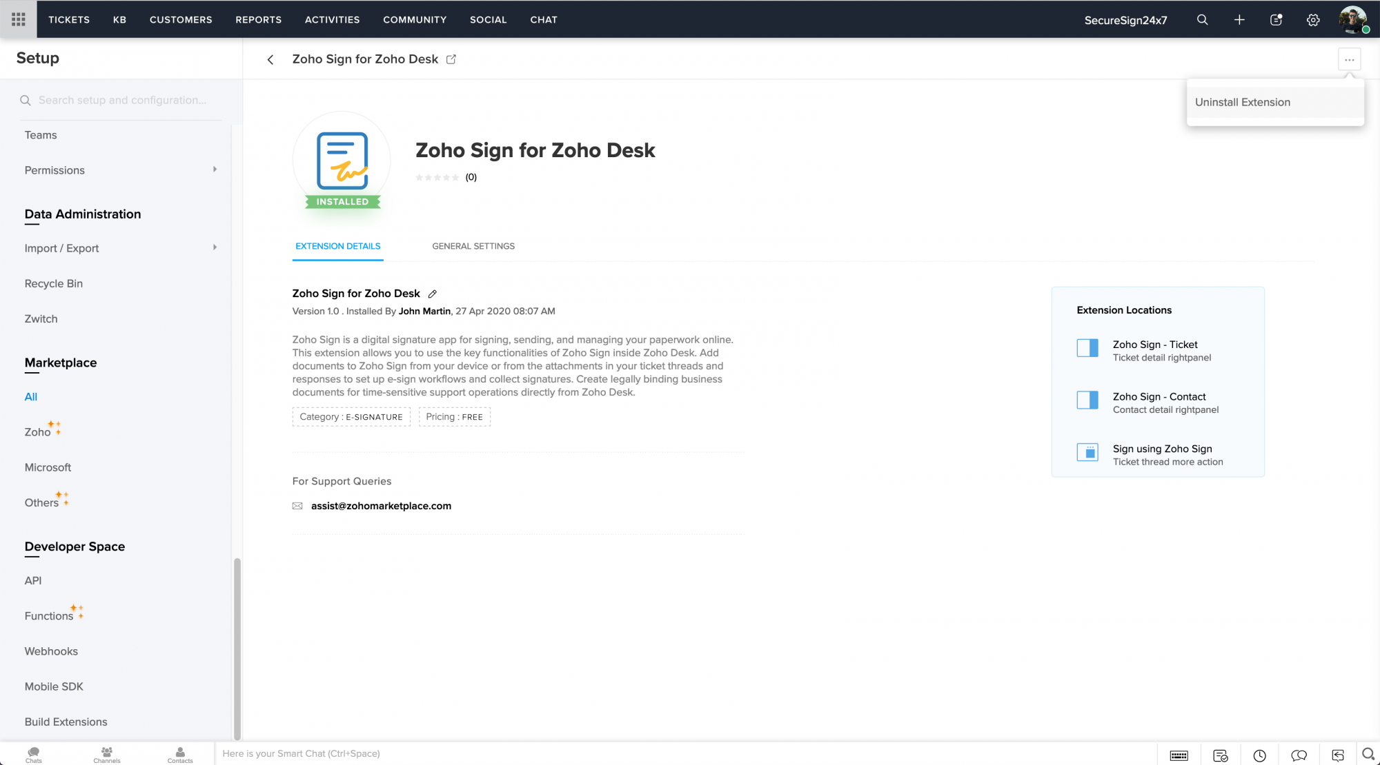 Zoho Desk で Zoho Sign 拡張機能をアンインストールする手順: