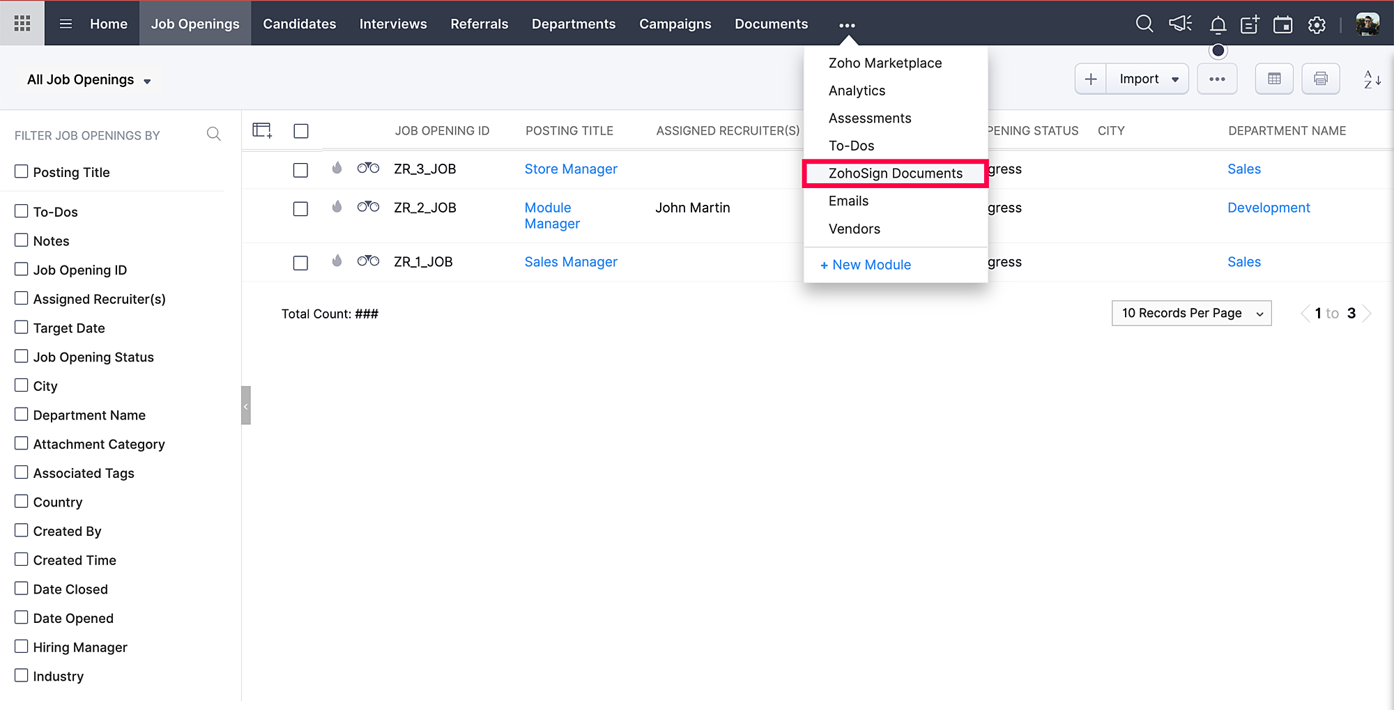 Zoho Recruit用Zoho Sign拡張機能で招待ドキュメントを送信する方法