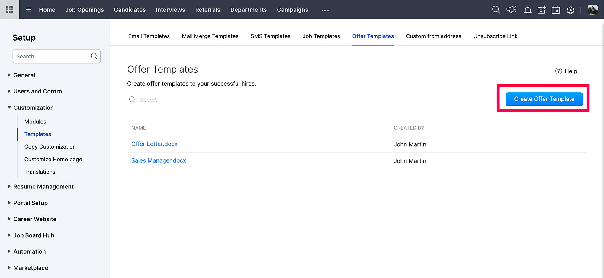 Offer letter テンプレートをアップロード/管理するにはどうすればよいですか?