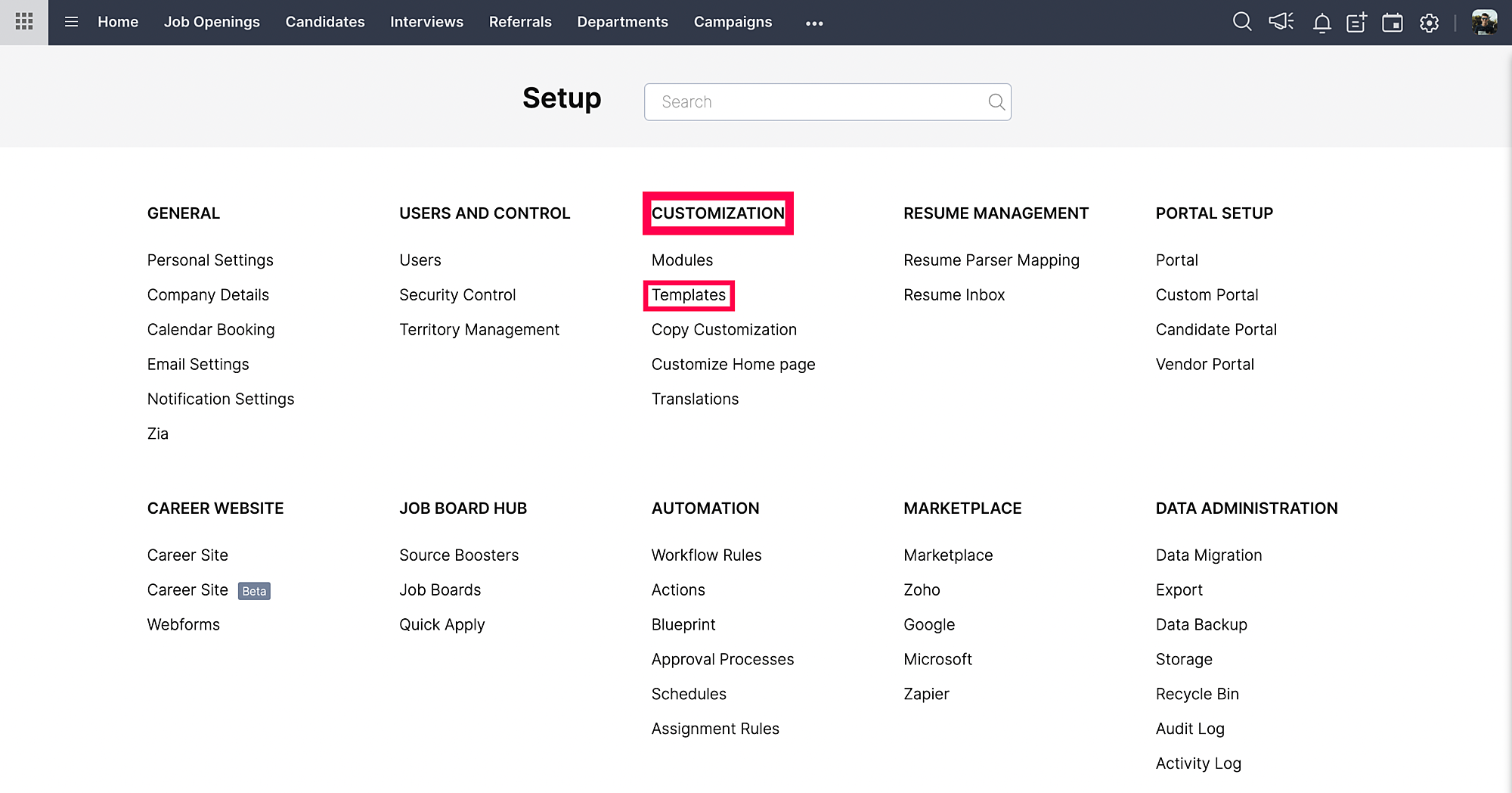 2. Recruitのセットアップページが表示されます。カスタマイズ内のテンプレートをクリックします。