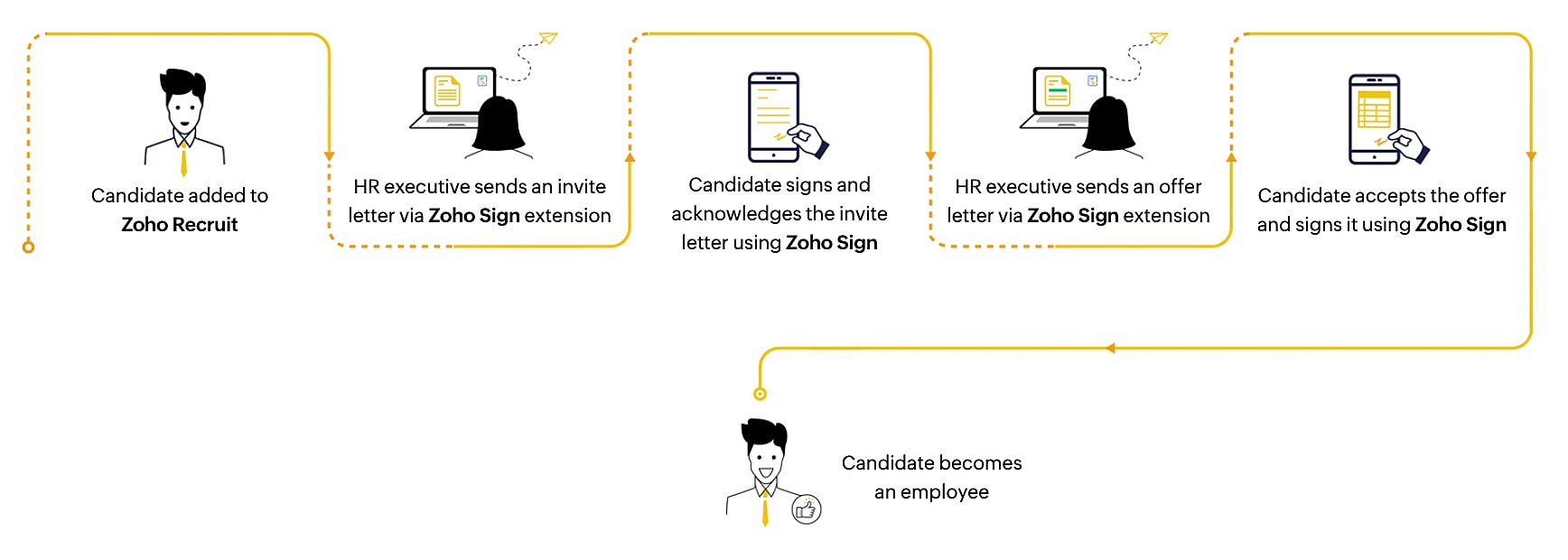 Zoho SignとZoho Recruitの連携により、オファーレターの送信や管理だけでなく、アプリケーション内で差出人から署名を収集することも可能になります。