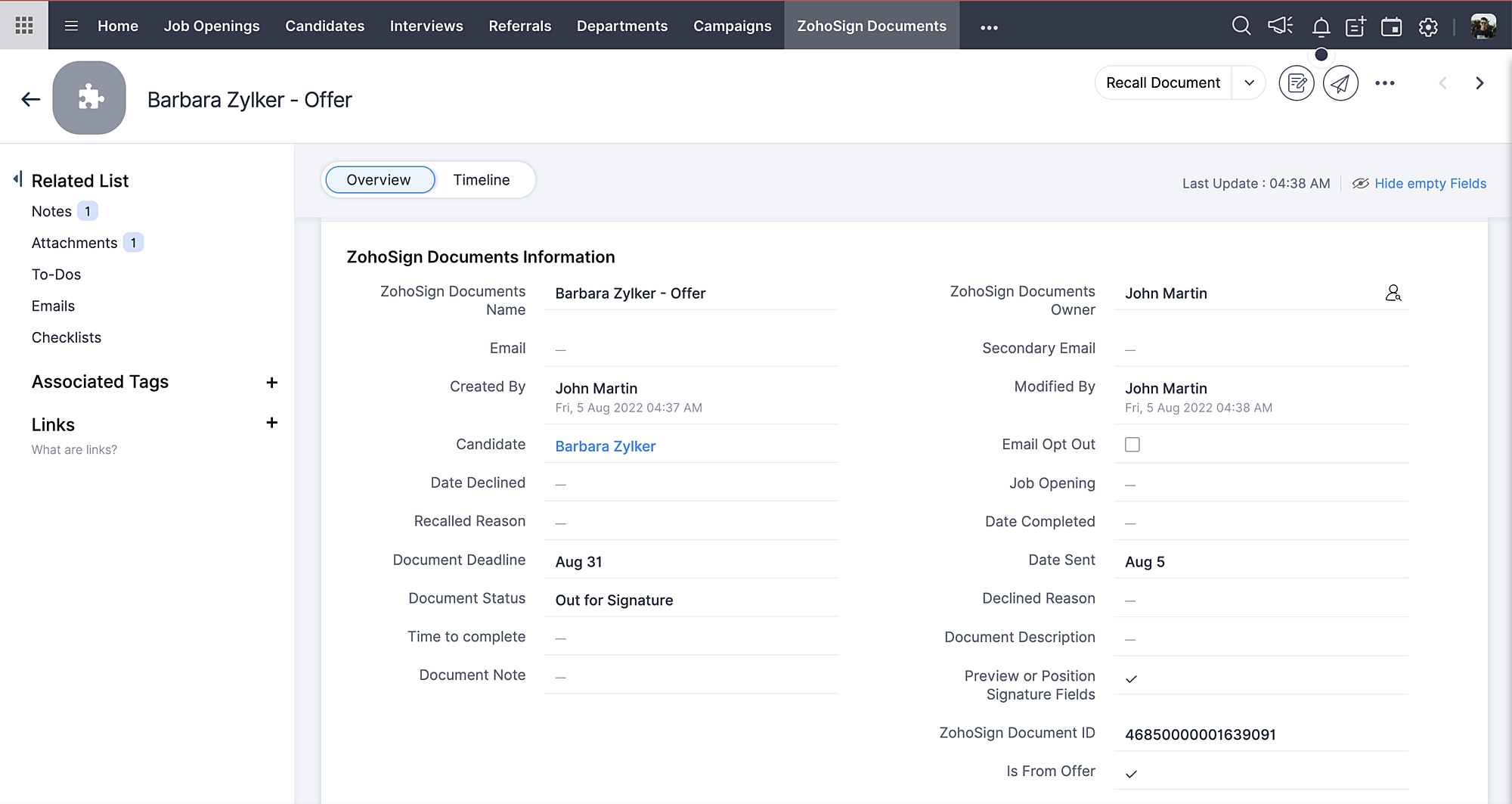 2. 対象の候補者を選択し、Zoho Sign ドキュメントの情報を表示します。