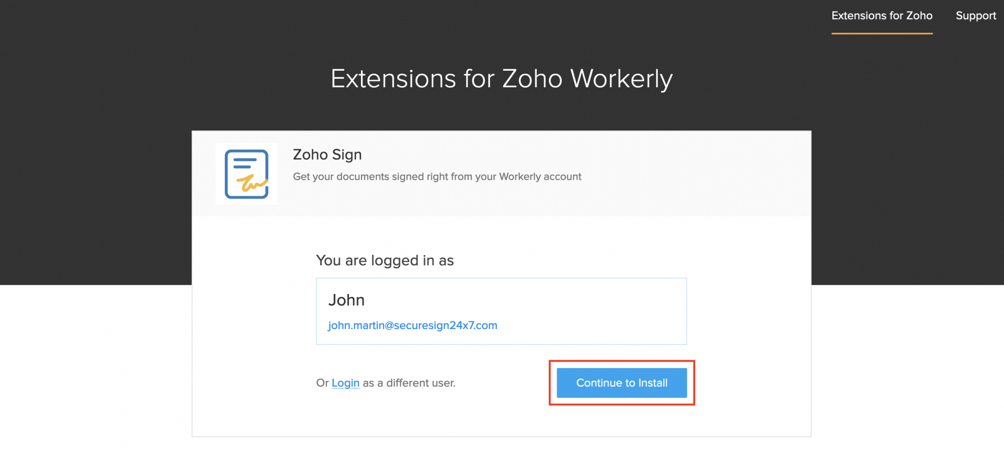 5. Zohoアカウントにログインしていることを確認し、インストールを続行をクリックしてください。 異なるZohoアカウントに拡張機能をインストールしたい場合は、別のユーザーとしてログインオプションを使用して再ログインして続行します。