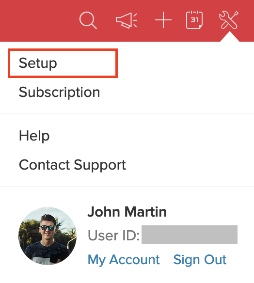 1. 右上のコーナーにある 設定 ドロップダウンを開き、 セットアップ をクリックしてください。