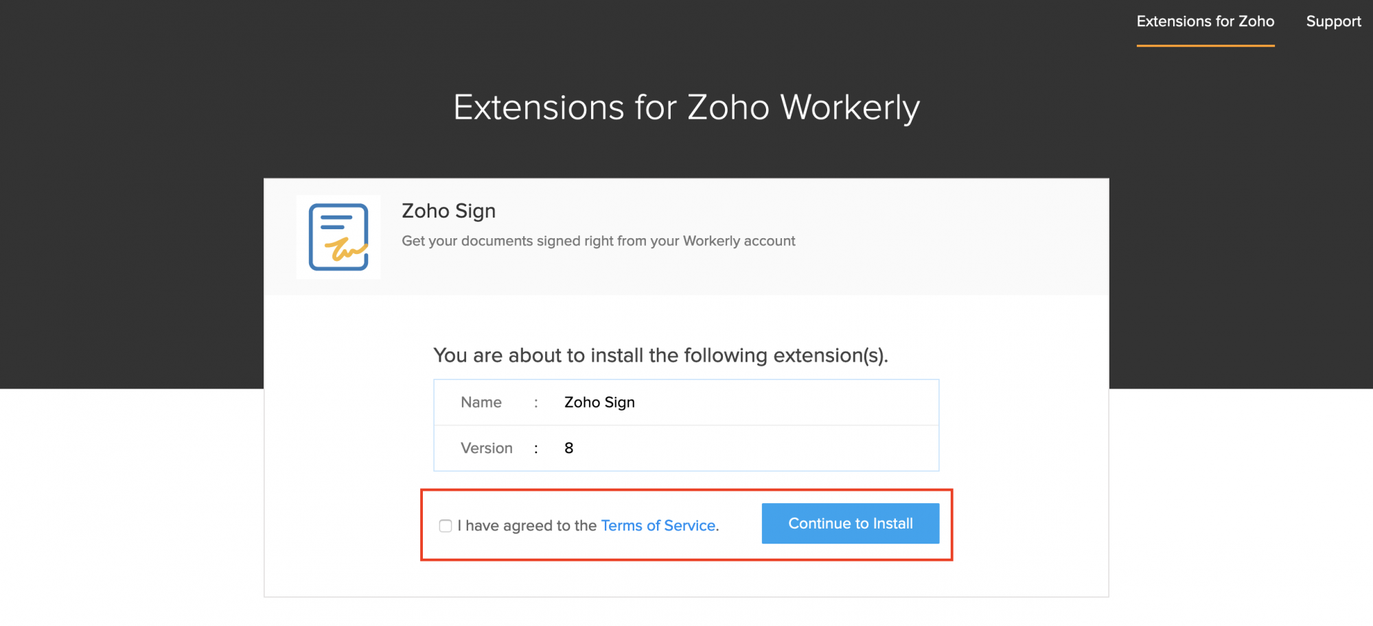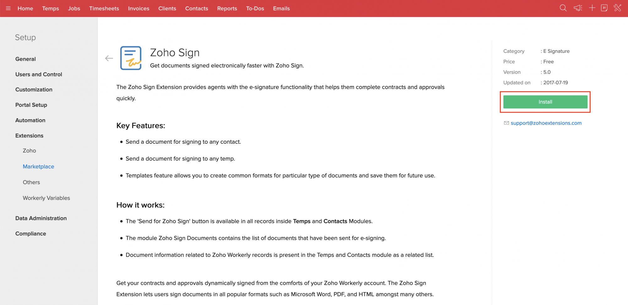 Zoho Workerly に Zoho Sign 拡張機能をインストールする手順: