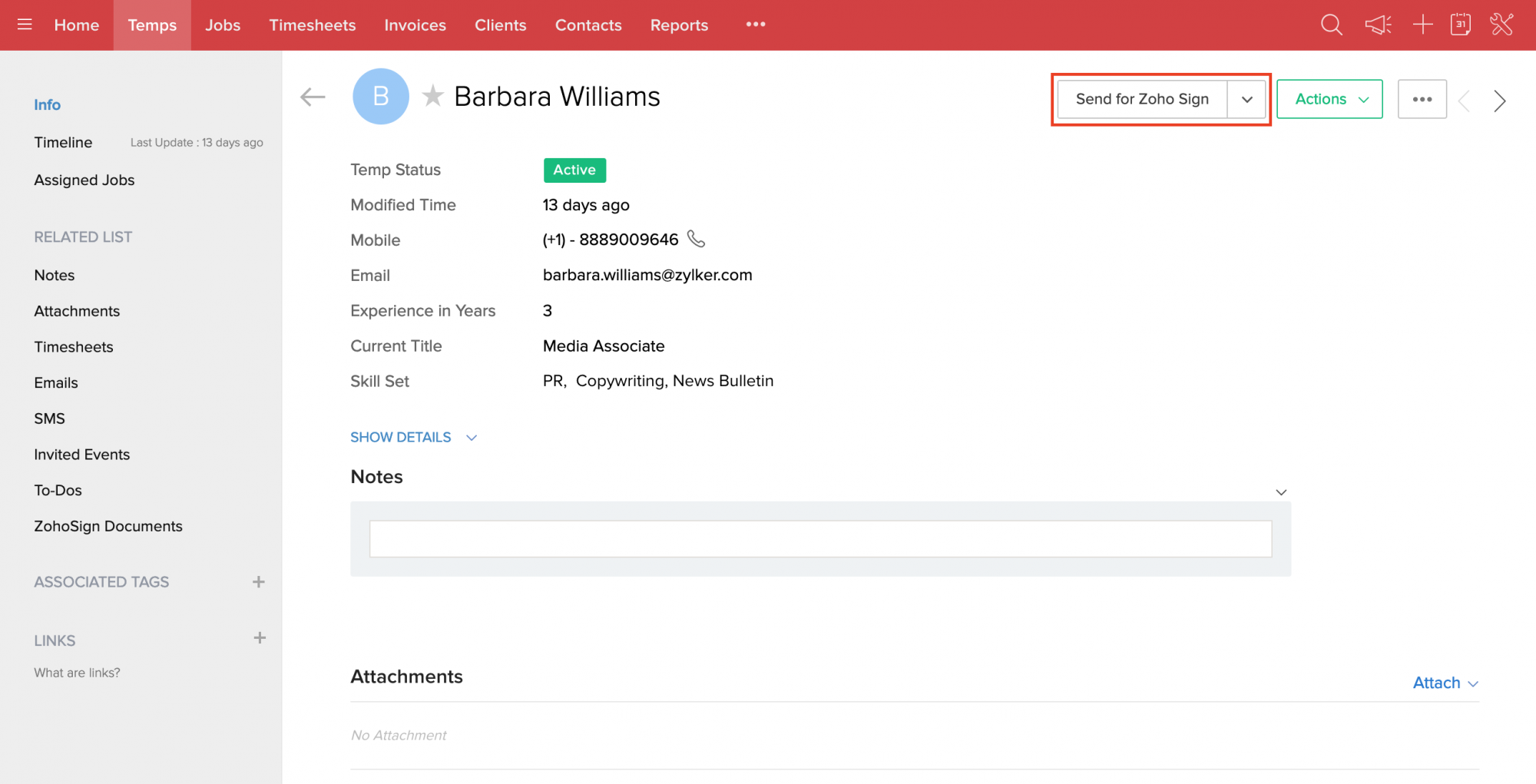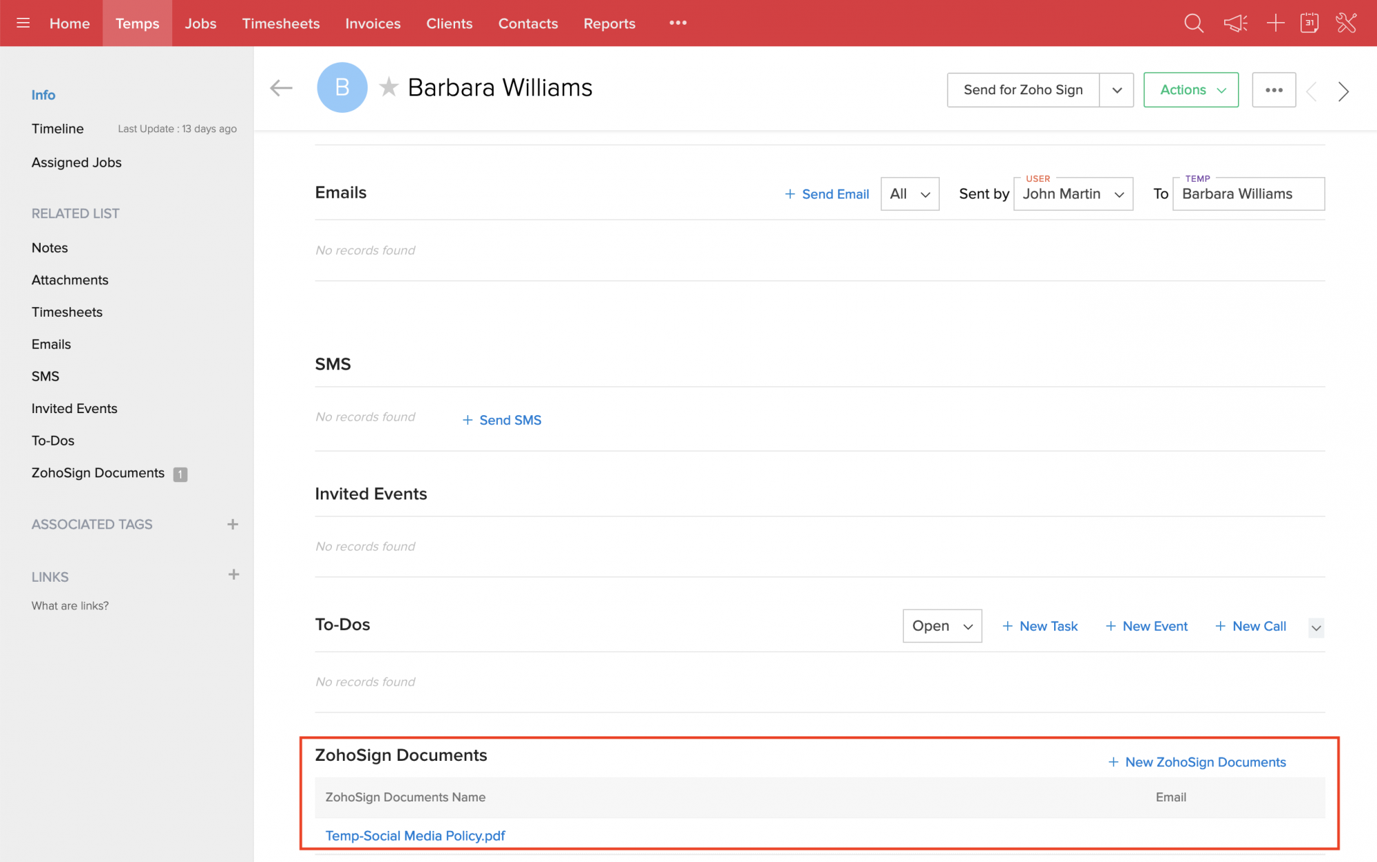 1. インストール完了後、「Temps and Contacts」モジュールの各レコードの詳細ページに「Send for Zoho Sign」というボタンが表示されます。このボタンを使用して、文書をデジタル署名することができます。