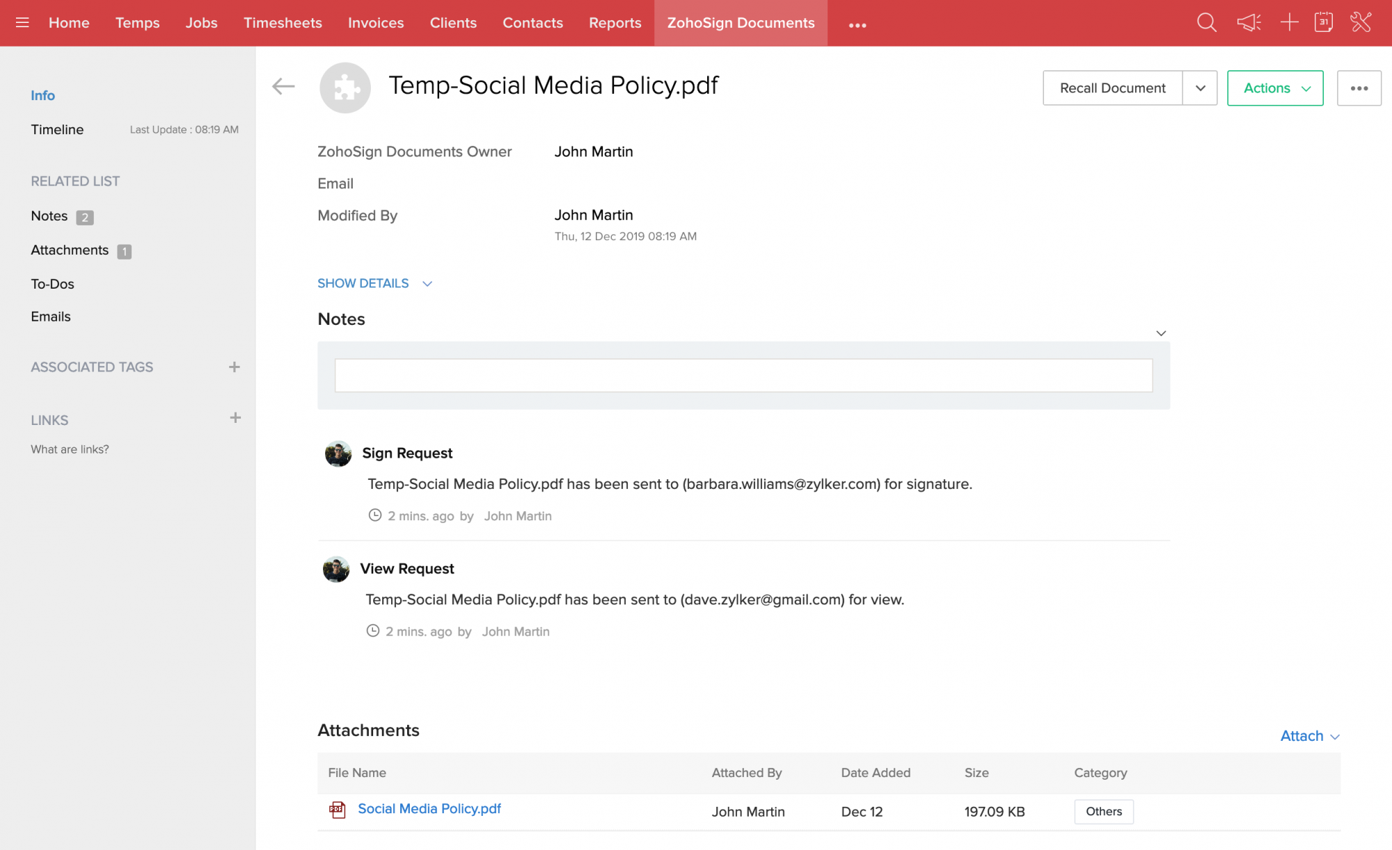 1. 関連レコードを「Temps」または「Contacts」モジュールに移動し、「Zoho Sign Documents」セクションからドキュメントの詳細ページを開きます。または、「Zoho Sign Documents」モジュールに直接移動し、ドキュメントの詳細ページを開くこともできます。