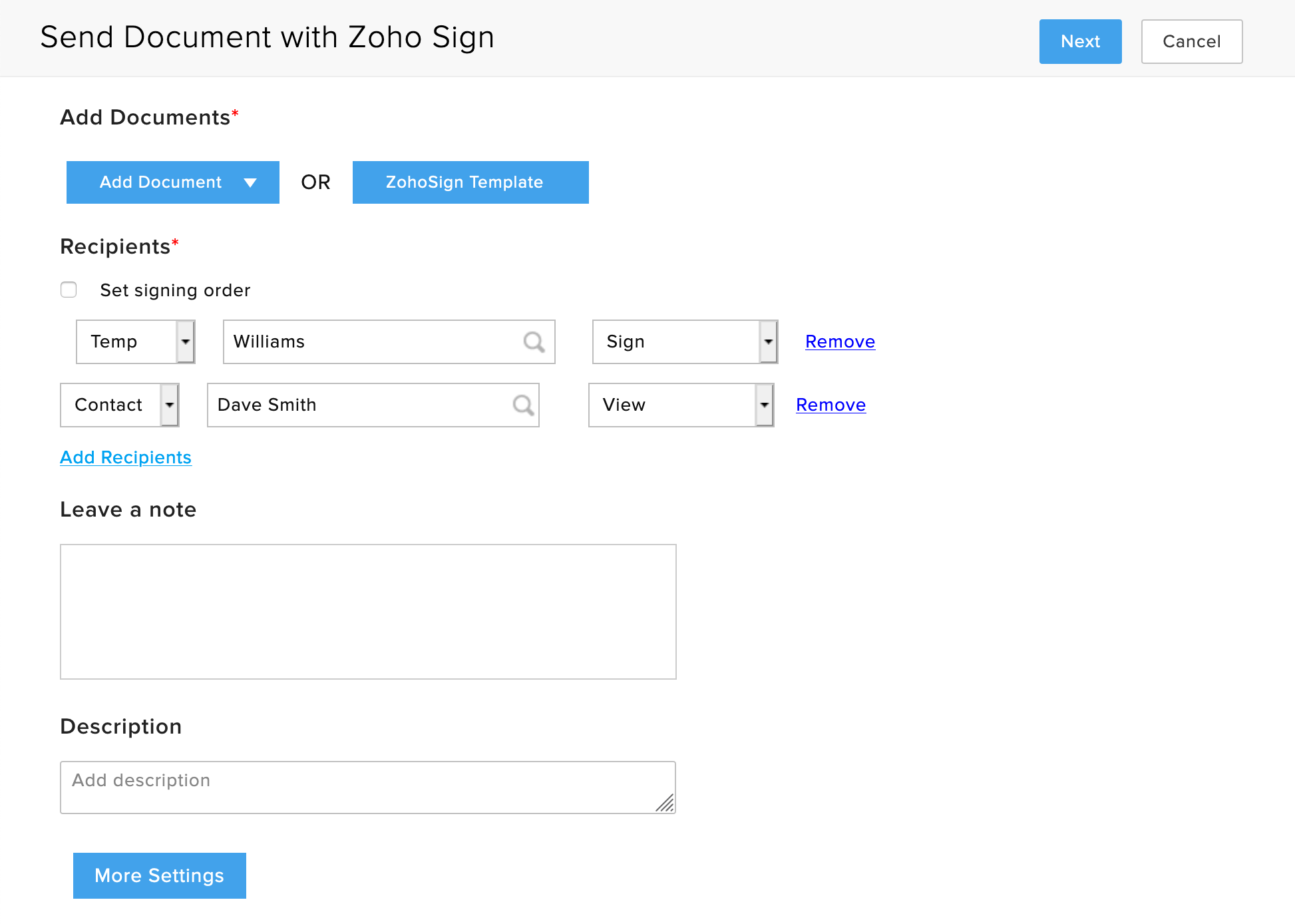 2. Zoho Signのプロフェッショナルまたはエンタープライズエディションをご利用の場合は、Zoho Signテンプレートからドキュメントを追加することもできます。