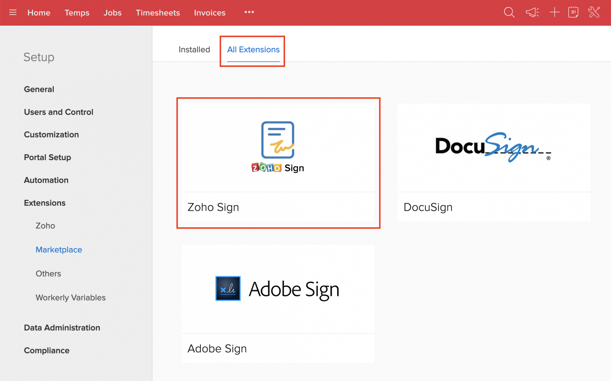 注意:Zoho Signの拡張機能は、Zoho Workerlyの有料プランでのみアクセスできます。