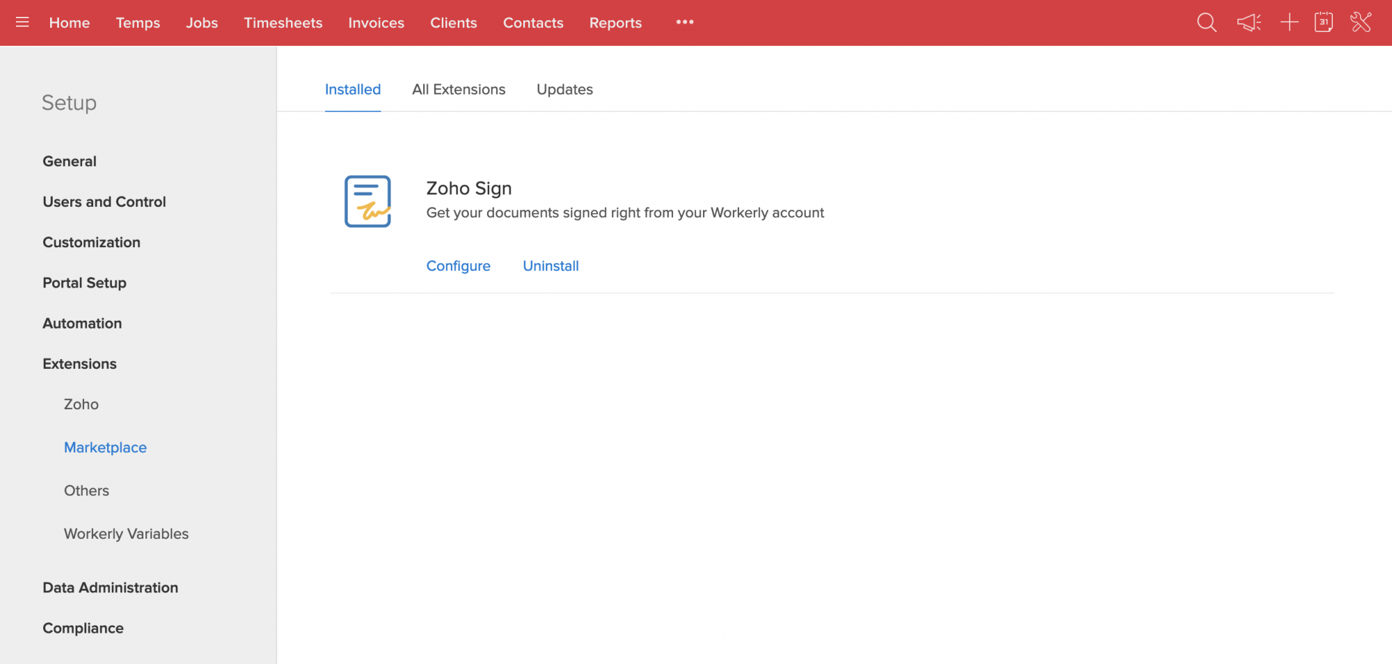 Zoho Workerly で Zoho Sign 拡張機能をアンインストールする手順: