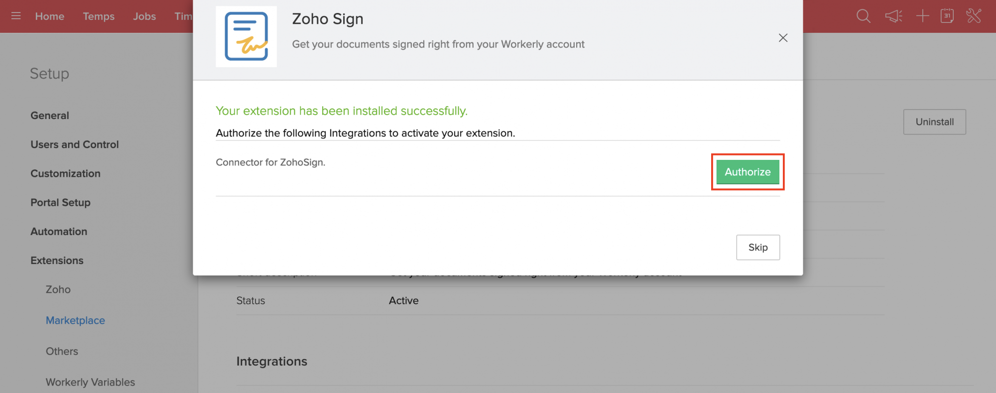10. Zoho SignとWorkerlyのアカウントが正常に接続され、拡張機能が完全にインストールされた後、承認が完了します。