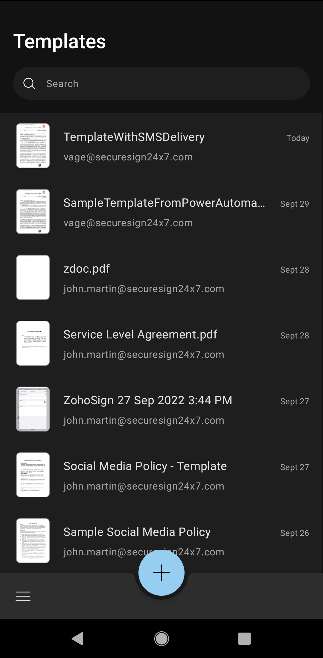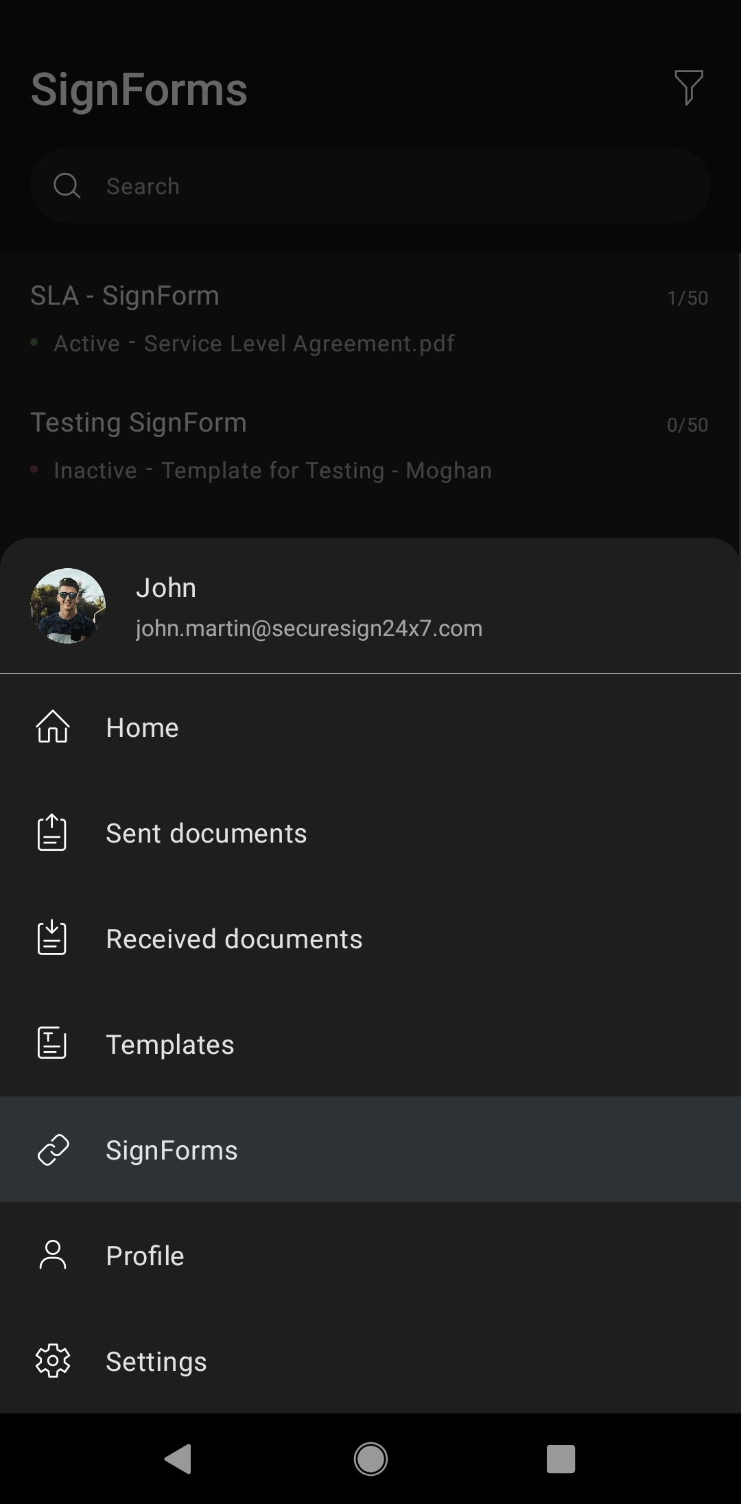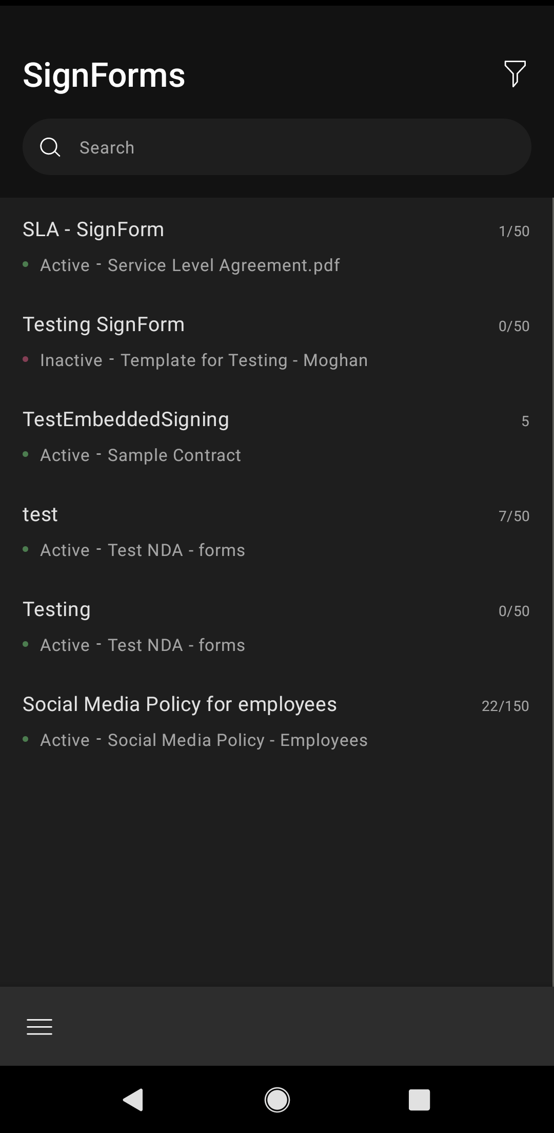 Zoho Signを使用すると、AndroidアプリからSignFormsのアクセスと管理が可能です。SignFormを有効にしたり無効にしたり、名前を変更したり、有効期限を設定したり、認証を強制したり、認証の配信種類を設定したり、SignFormの応答を制限したりできます。また、アプリからSignFormsのURLとQRコードにもアクセスすることができます。