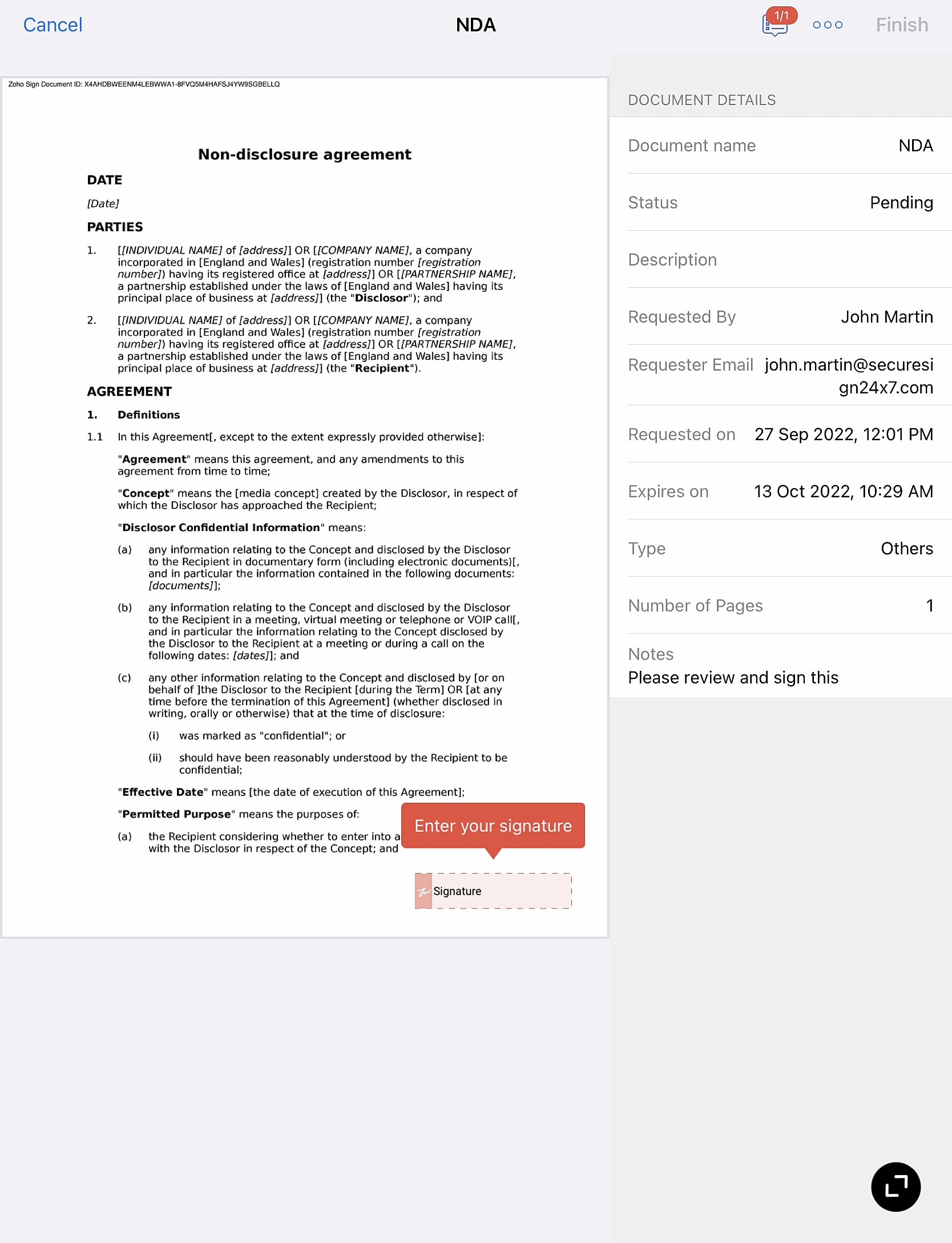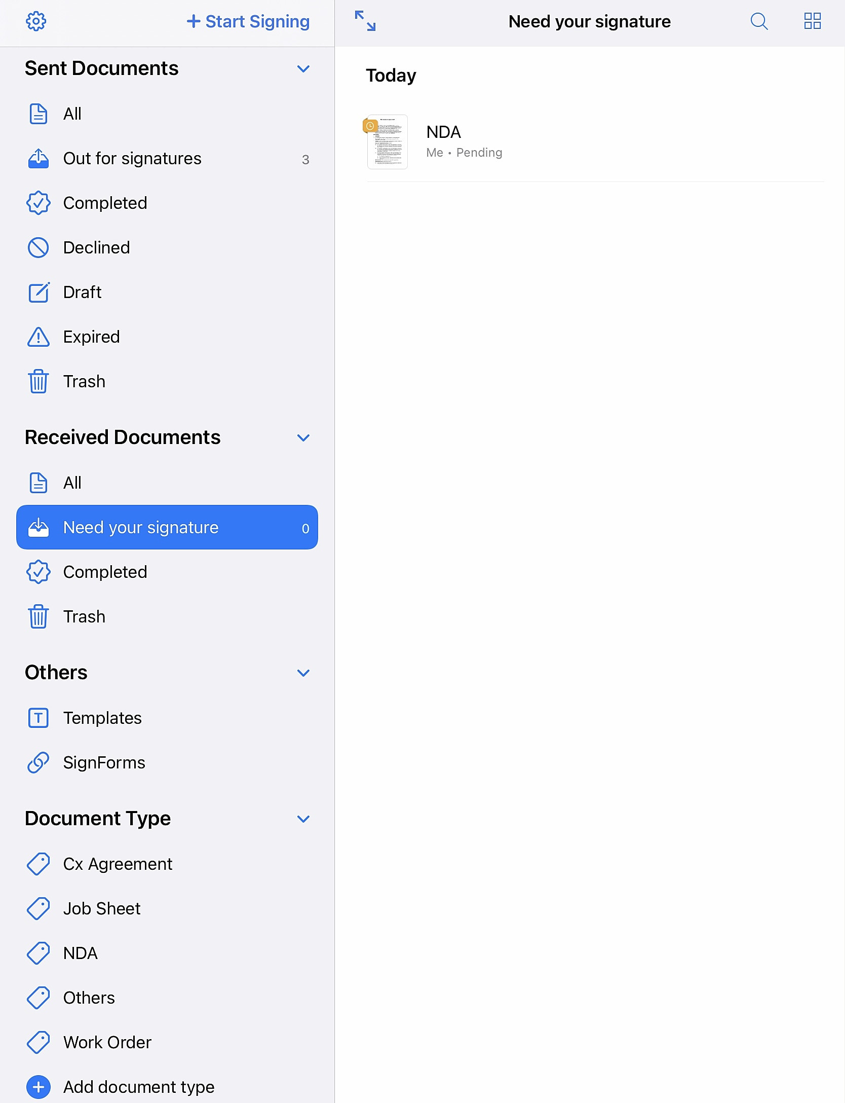 1. メニューの受領済みドキュメント差出人の下にあるNeed あなたの署名をタップします。
