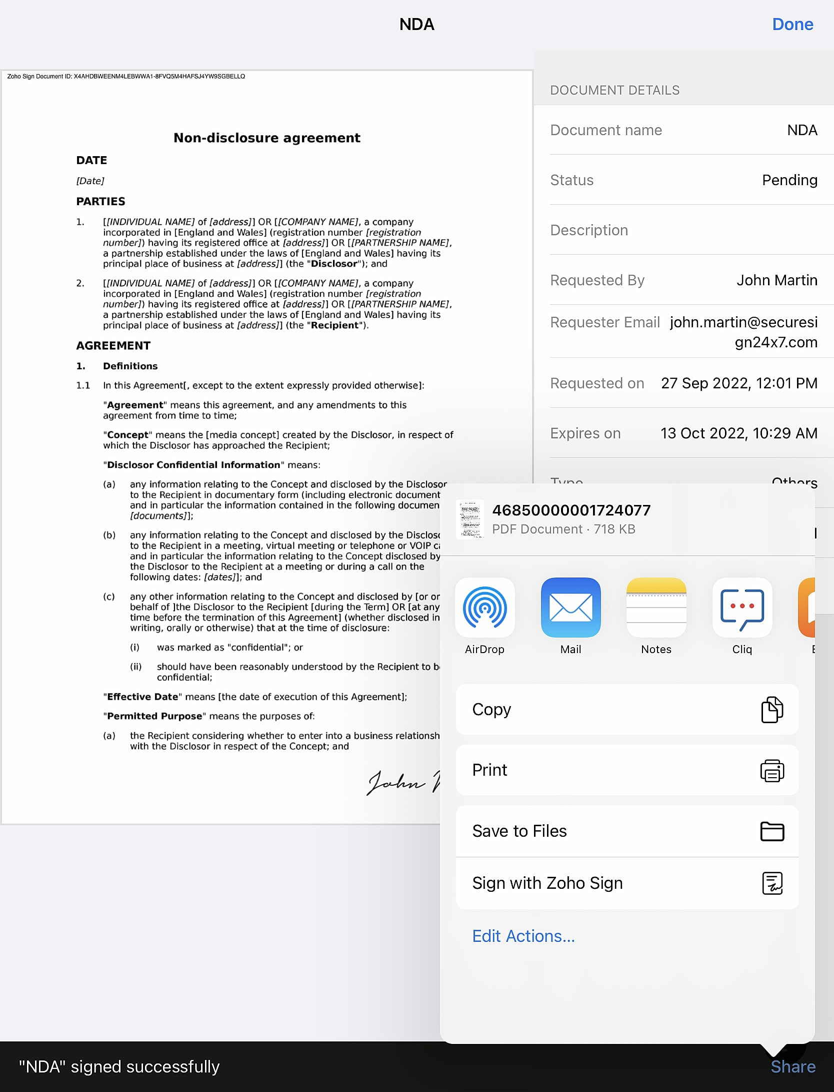 7. 共有するをタップして署名済みドキュメントを他のユーザーと共有したり、署名済みドキュメントを端末内に保存したりできます。