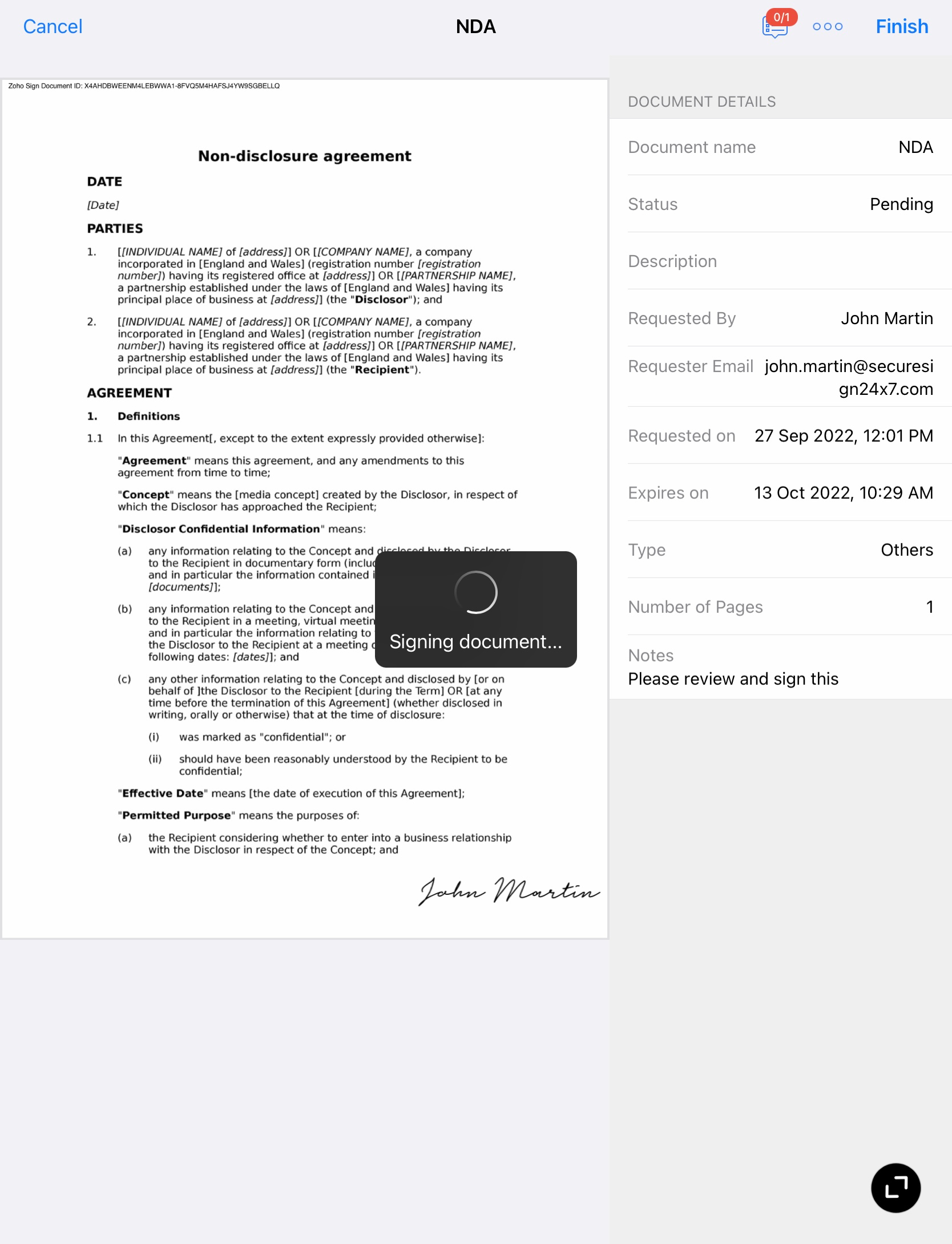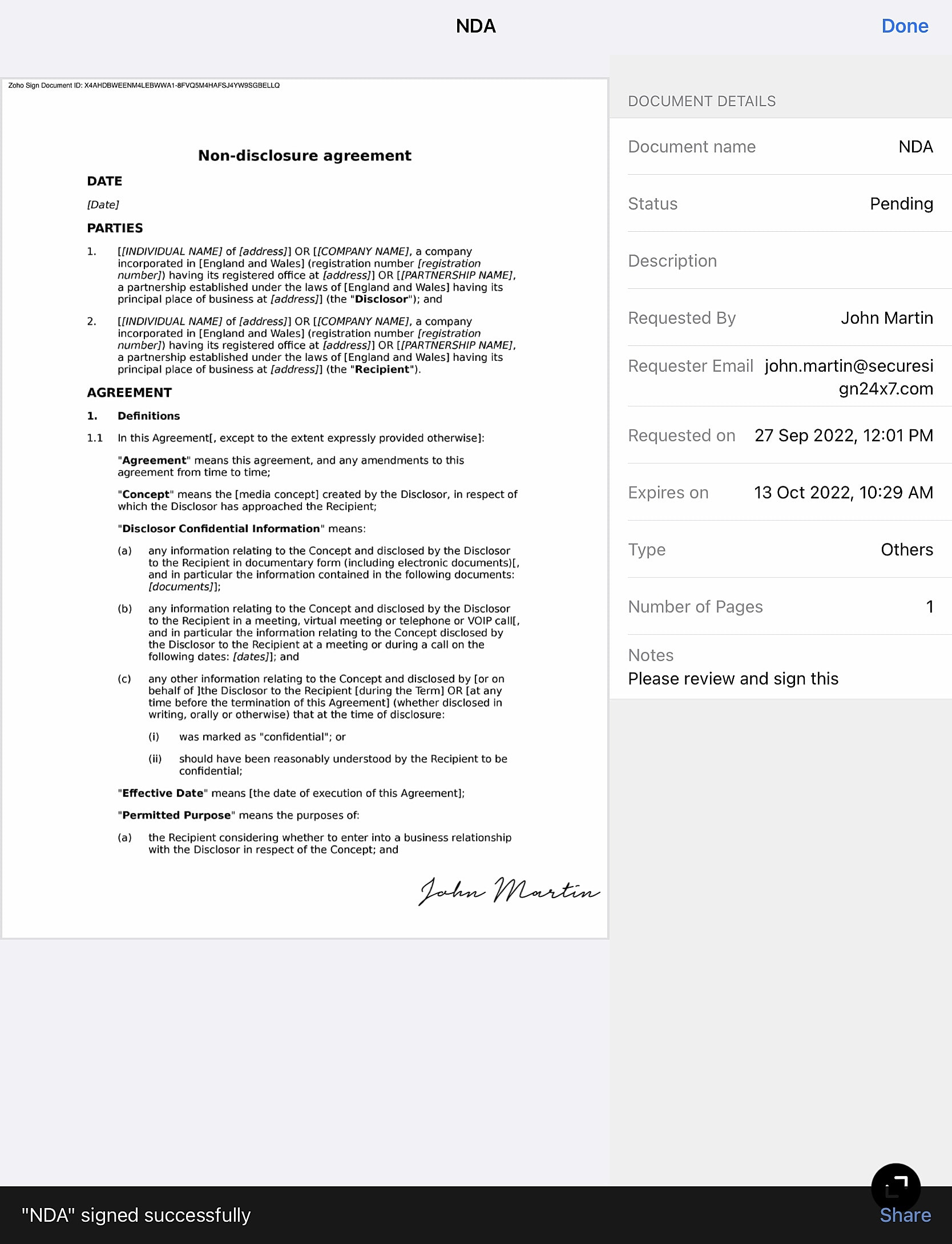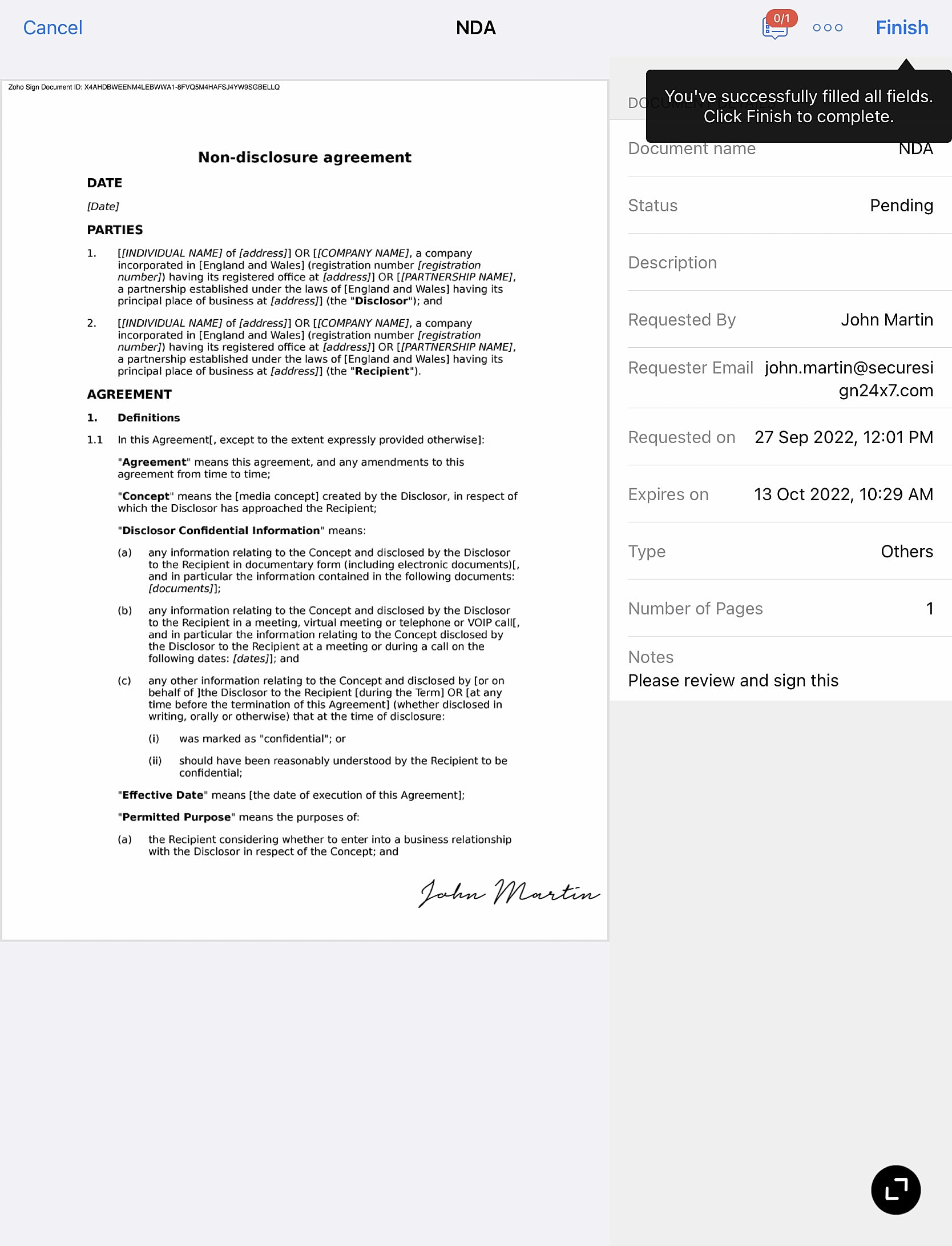 8. 完了するボタンをタップすると、完了証明書と署名済みドキュメントのコピーが登録済みメールアドレスに送信されます。