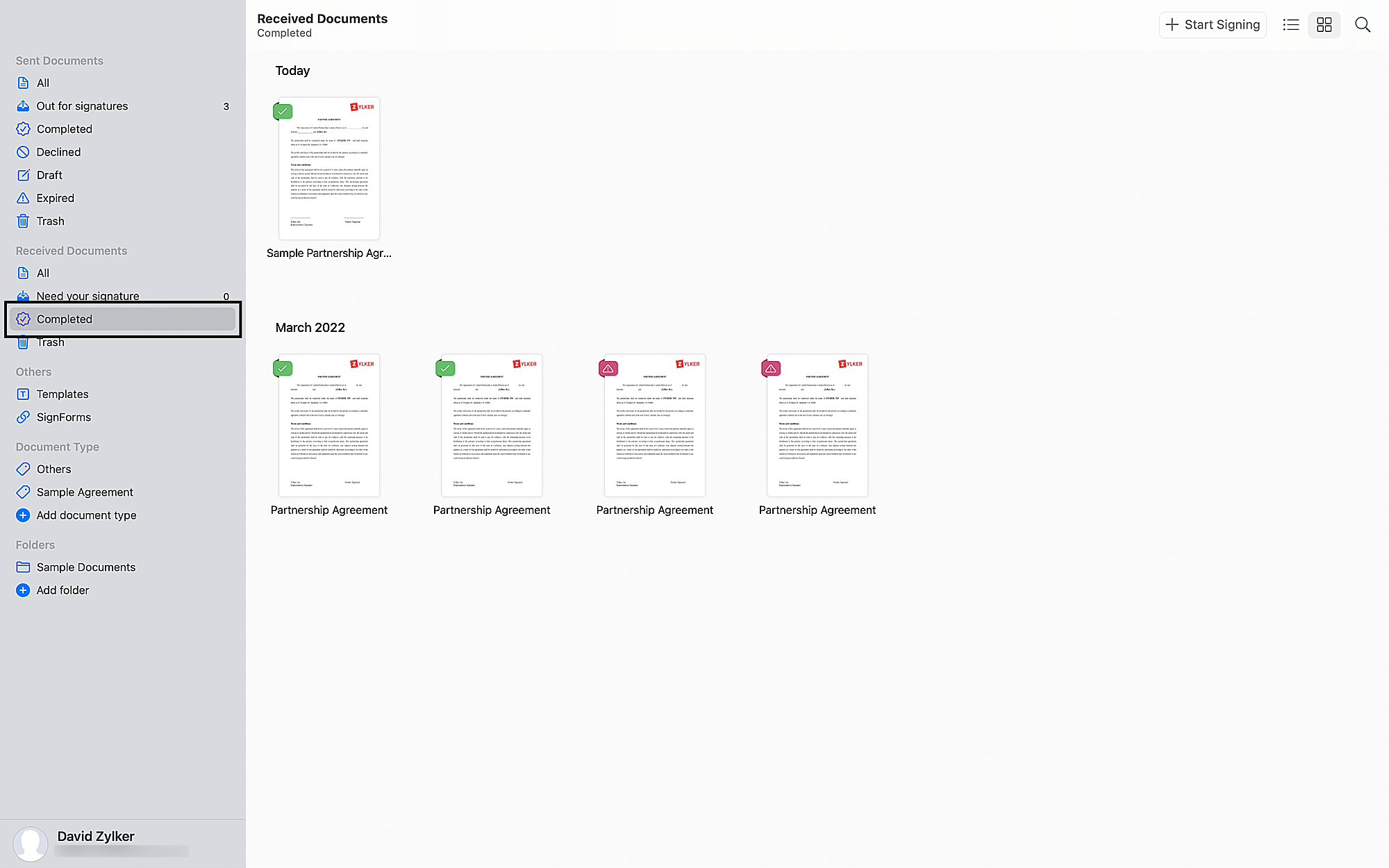 8. 受信済みドキュメントをすべて表示するには、Zoho Signダッシュボードの左側の受信済みドキュメントの下にある完了をクリックします。