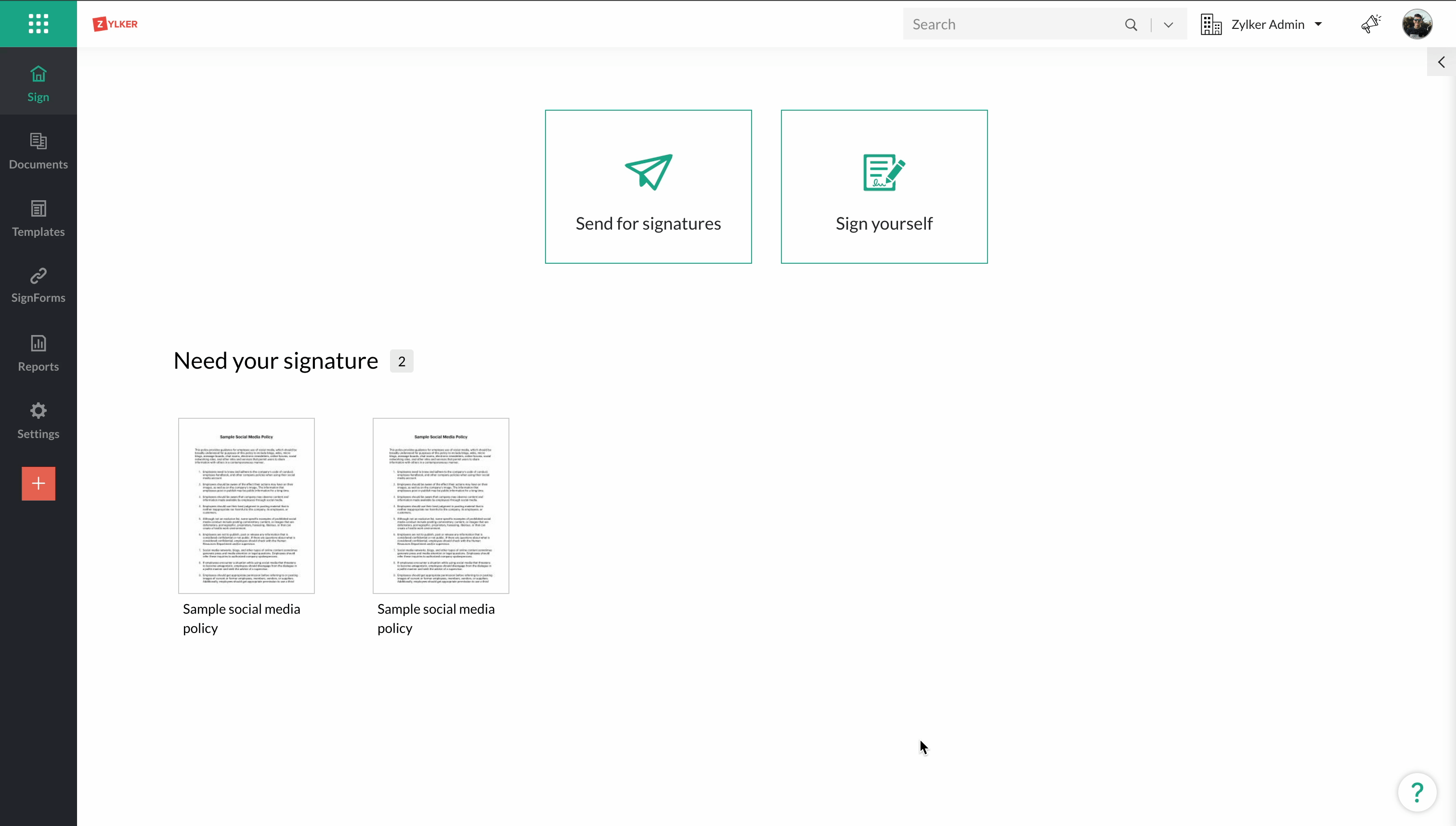 Zoho Signアプリケーションを起動し、ドキュメントを選択します。