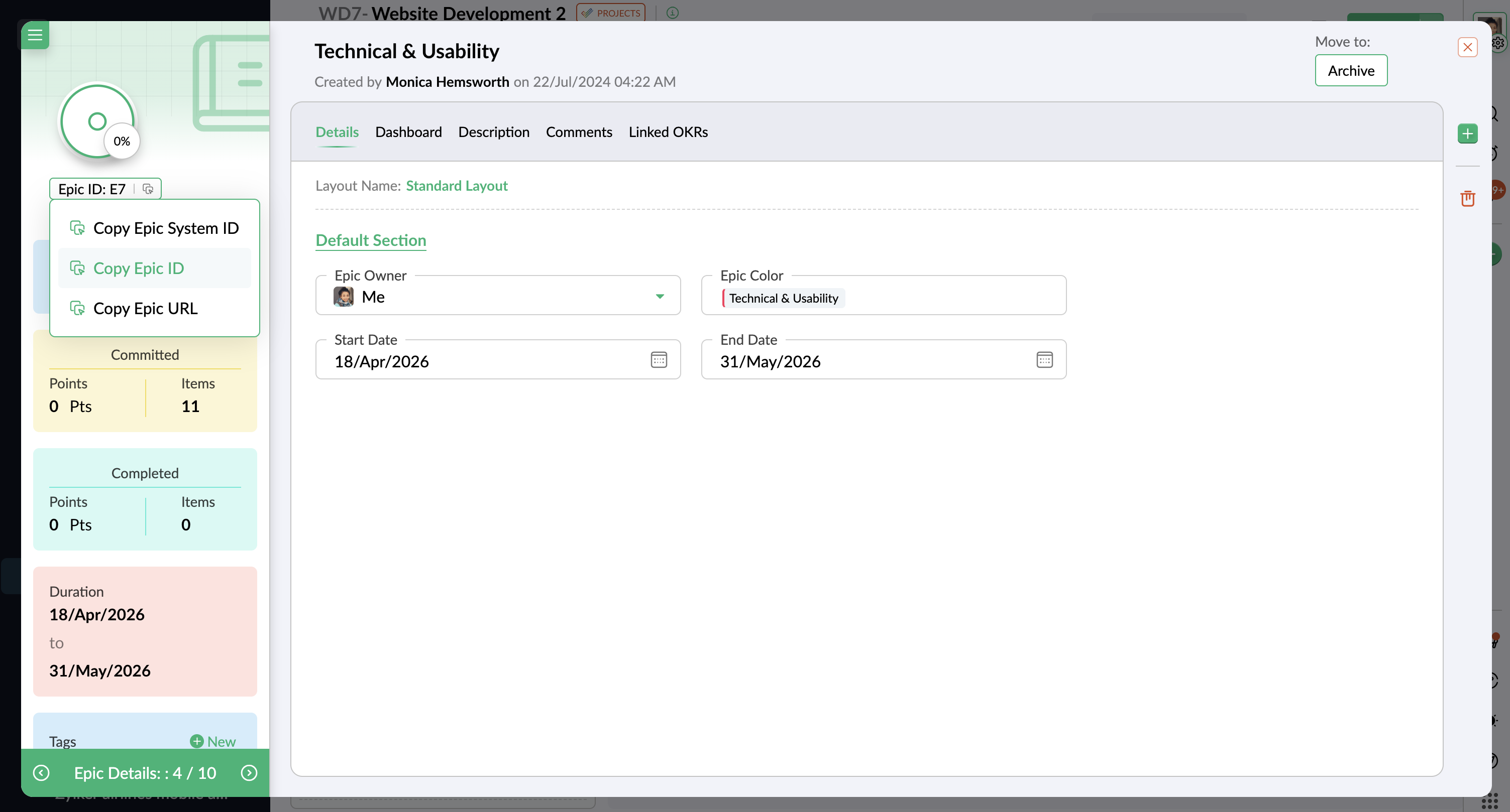 - 任意のエピックにカーソルを合わせ、[詳細]ボタンをクリックします。