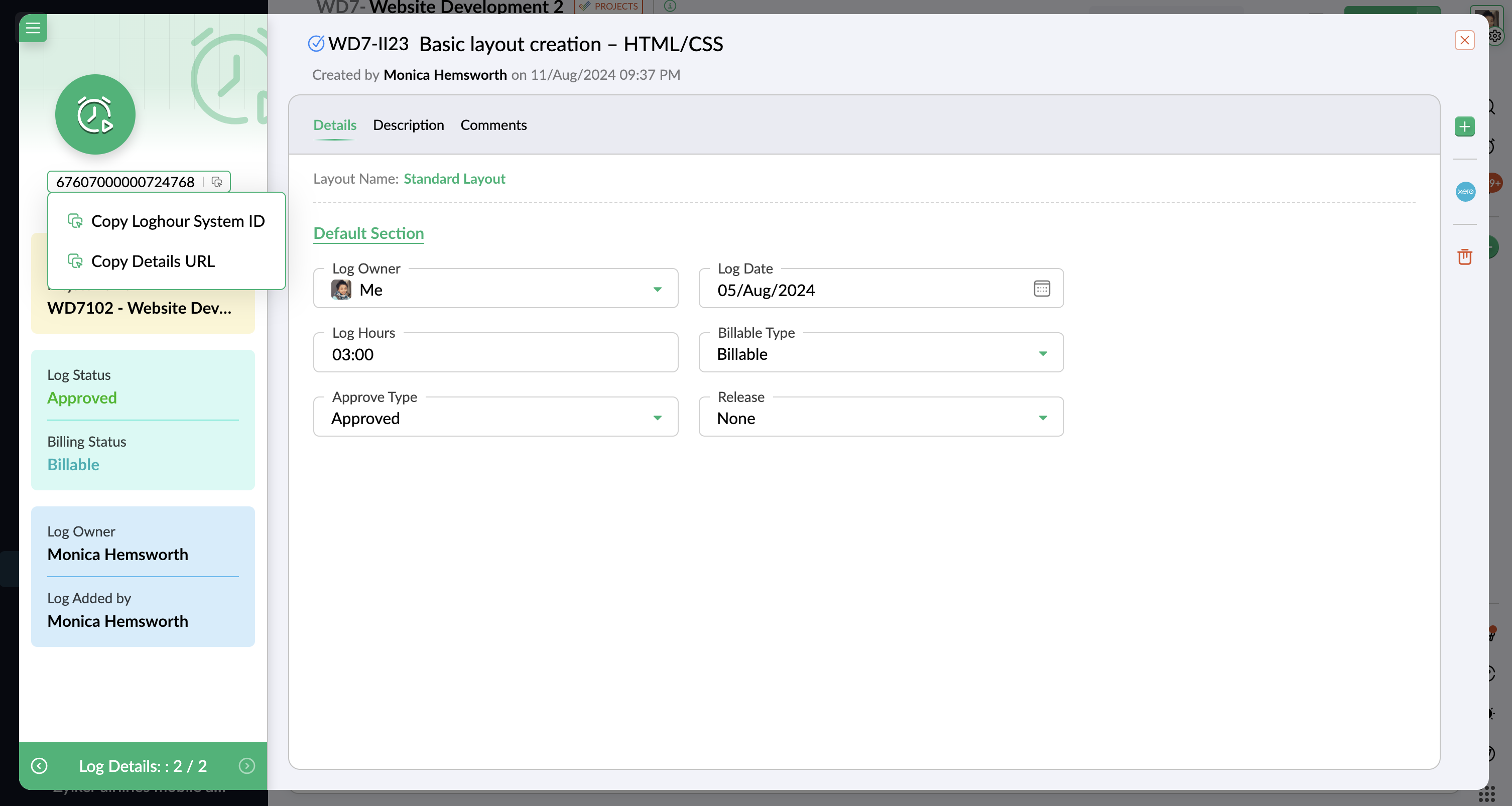 - [Copy Log Hour System ID] または [Copy Details URL] をクリックします。