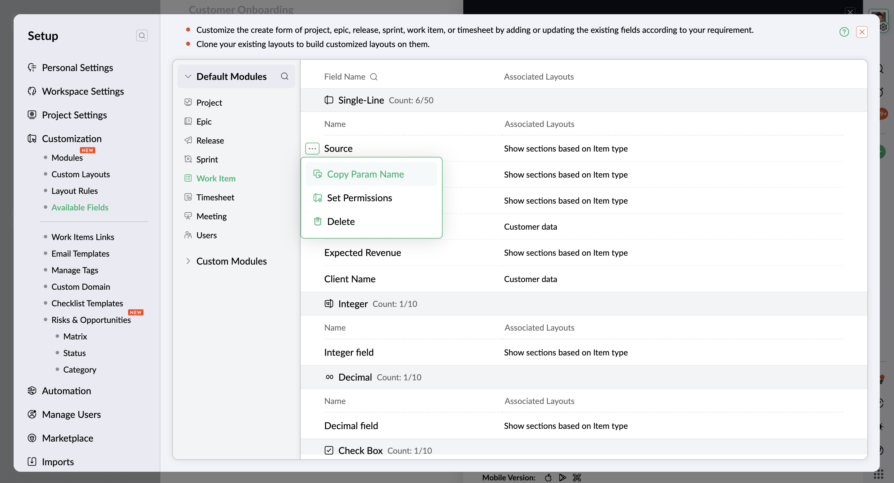 - [Customization] の下で [Available Fields] をクリックします。