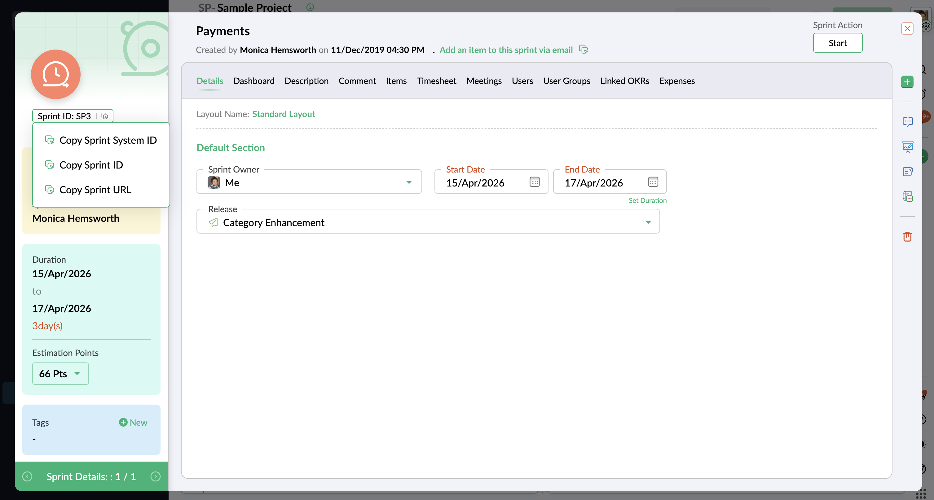 - [Copy Sprint System ID]、[Sprint ID]、[Copy Sprint URL] のいずれかを選択します。