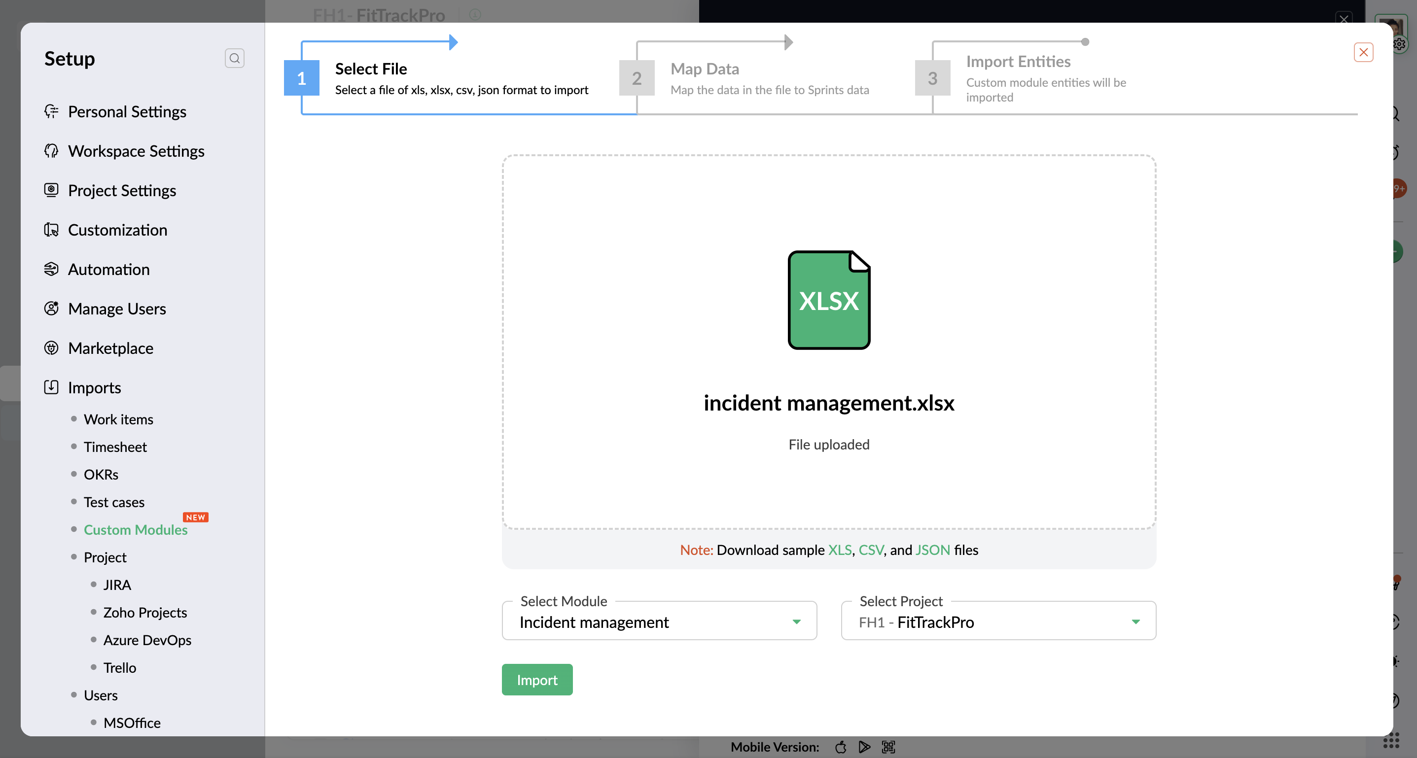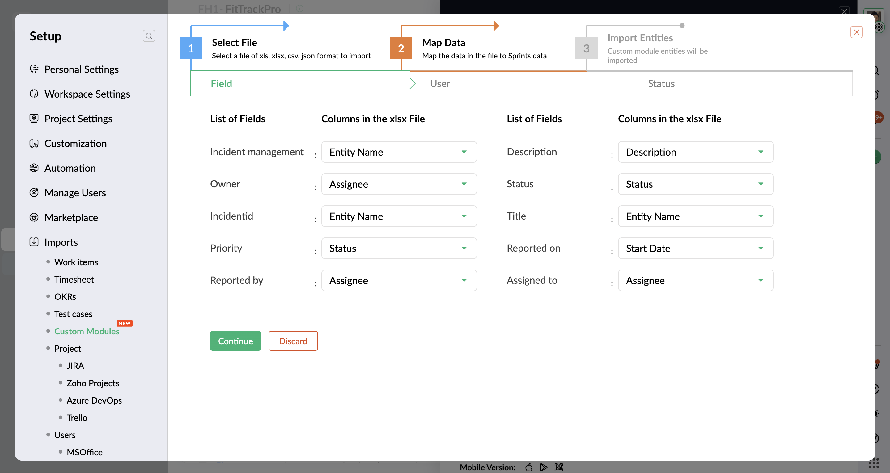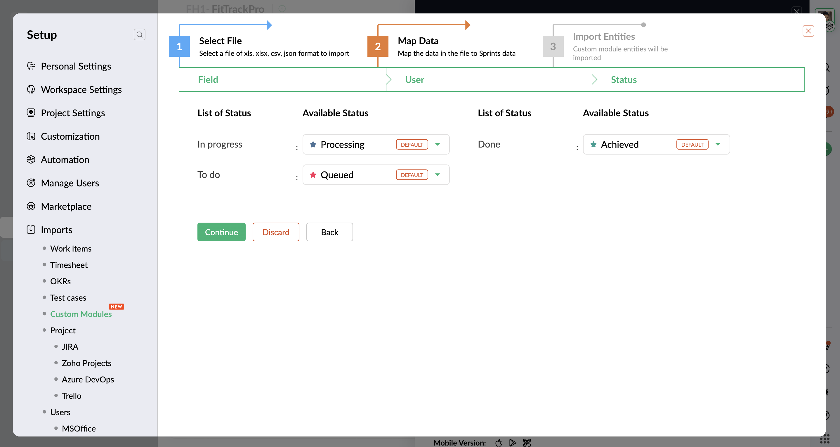 - ステータスのマッピング: ステータスを、Zoho Sprints で利用可能なステータスにマッピングします。続ける をクリックします。