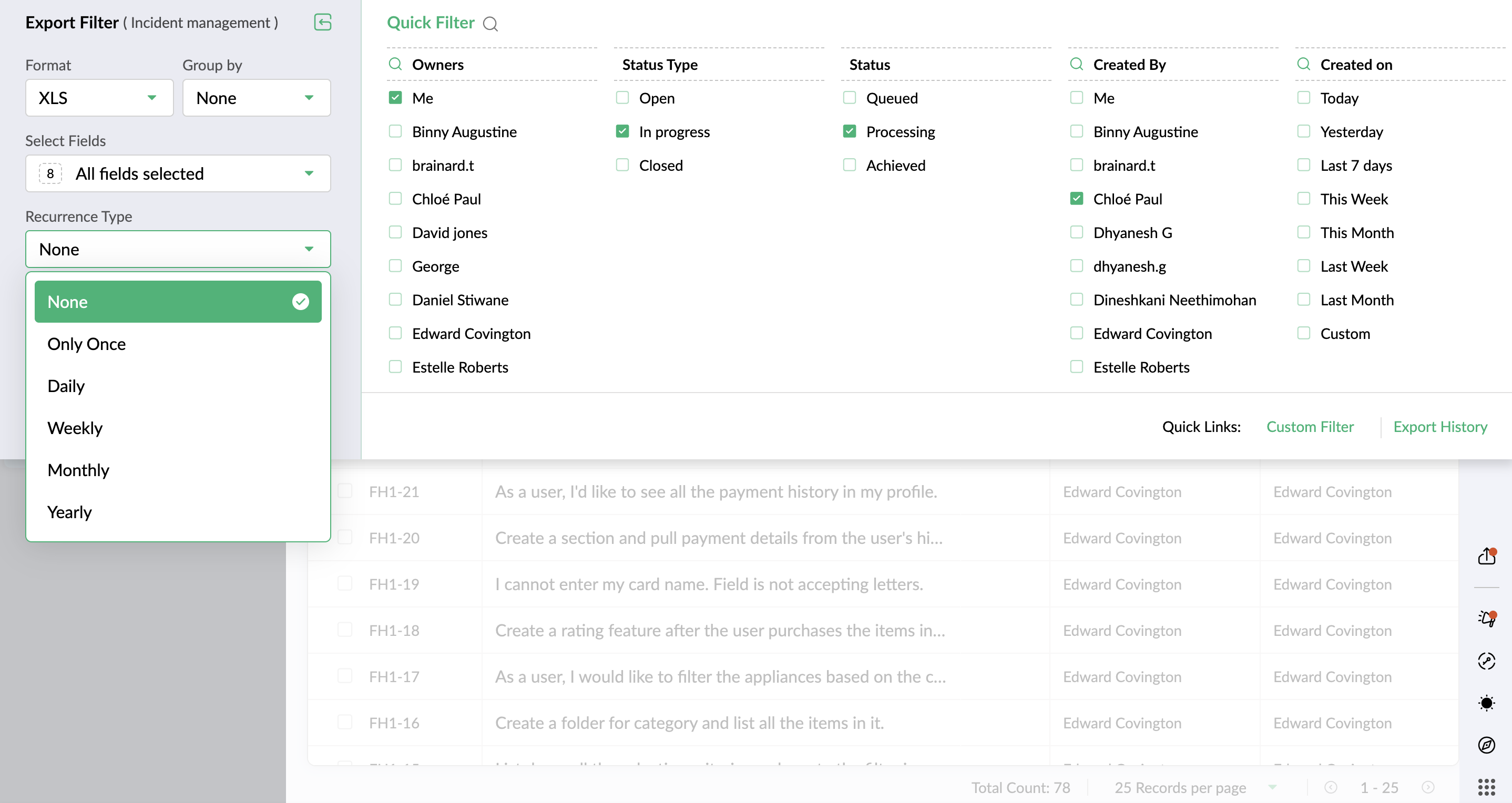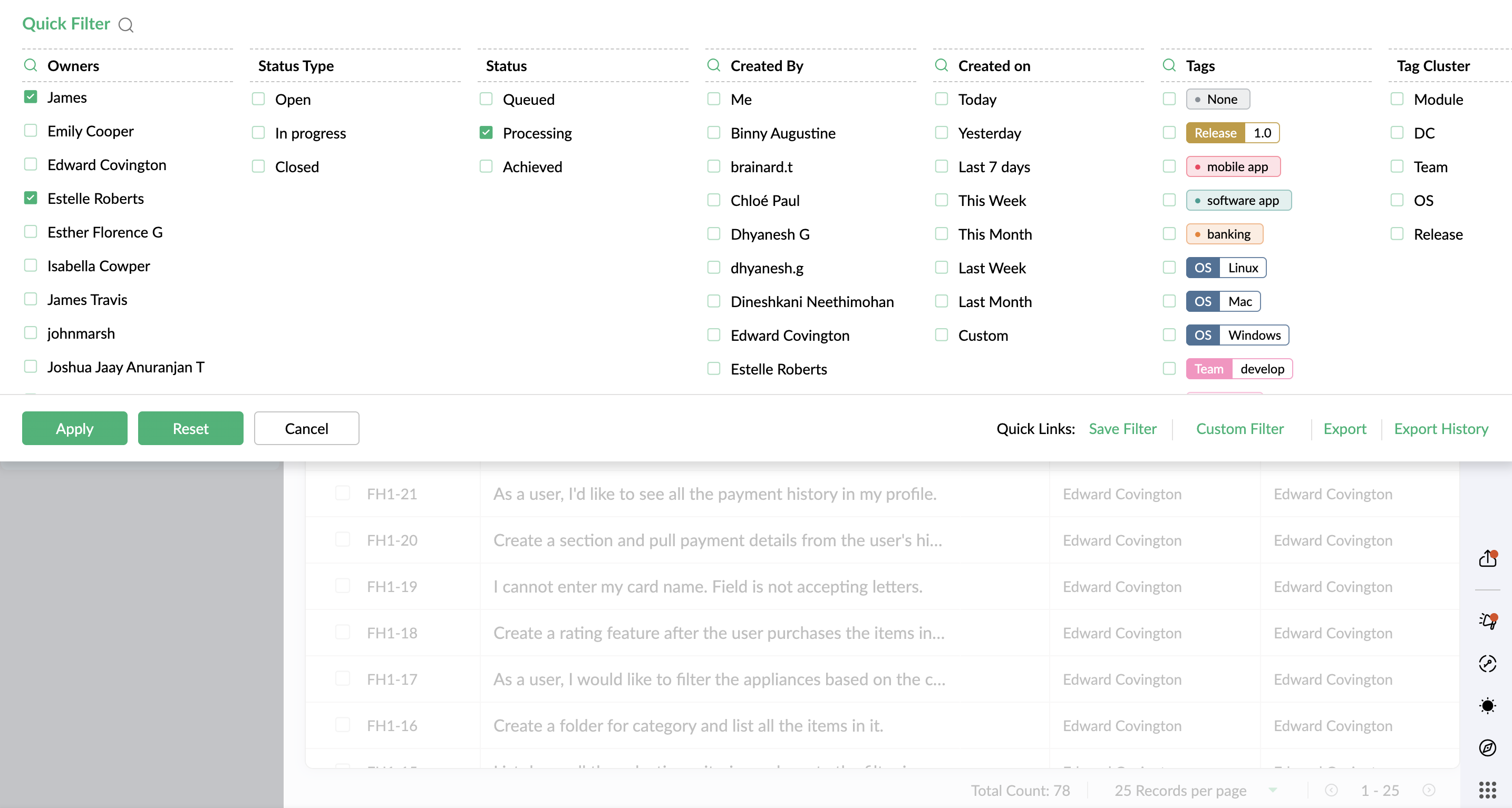 Zoho Sprints の他のタブと同様に、カスタムタブには 2 種類のフィルターがあります。