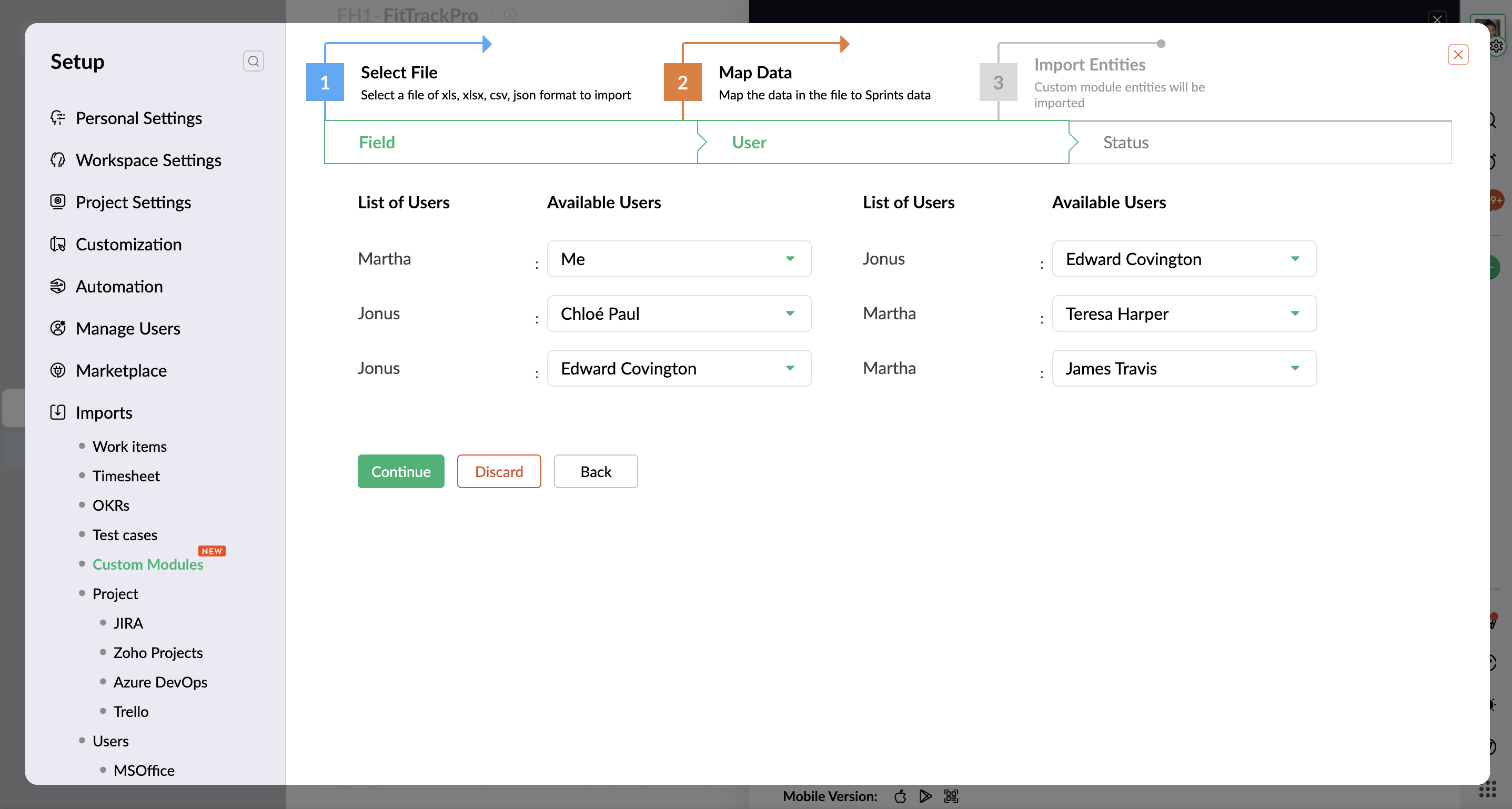 - ユーザーのマッピング: ユーザーを、Zoho Sprints で利用可能なユーザーにマッピングします。続ける をクリックします。