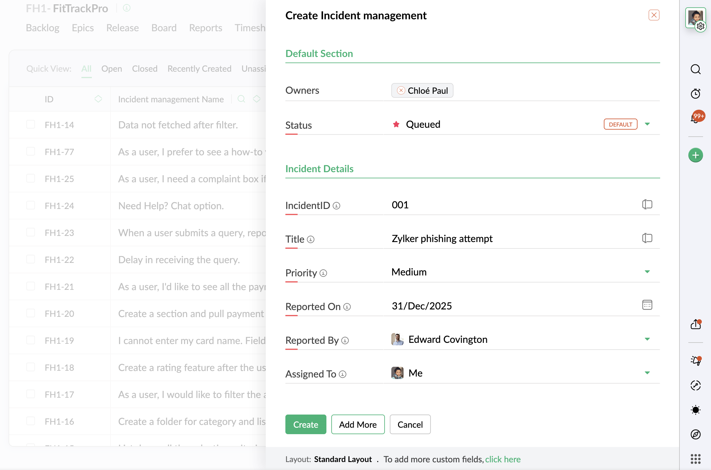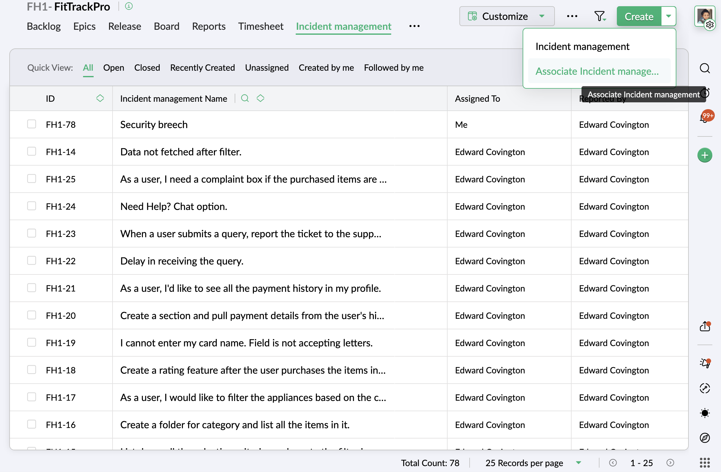 クイックフィルター: Zoho Sprints であらかじめ用意されているフィルターです。条件は、アプリケーションやプロジェクトに含まれる主要コンポーネントや詳細を基に構成されています。データを絞り込みたい条件に応じて、1 つまたは複数の属性を選択できます。