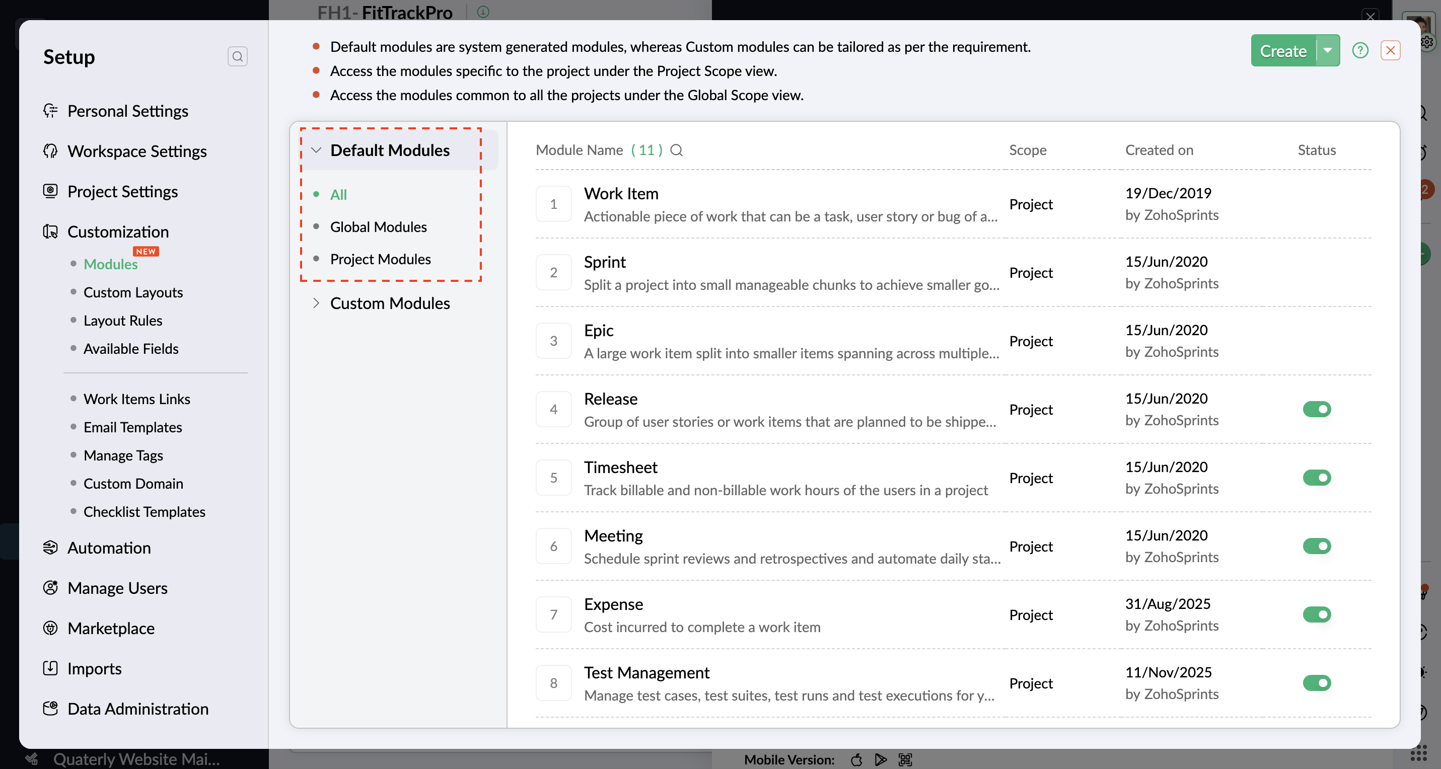 初期設定タブは、Zoho Sprints によってあらかじめ用意されている標準コンポーネントです。初期設定タブはさらに、グローバルタブとプロジェクトタブに分類されます。