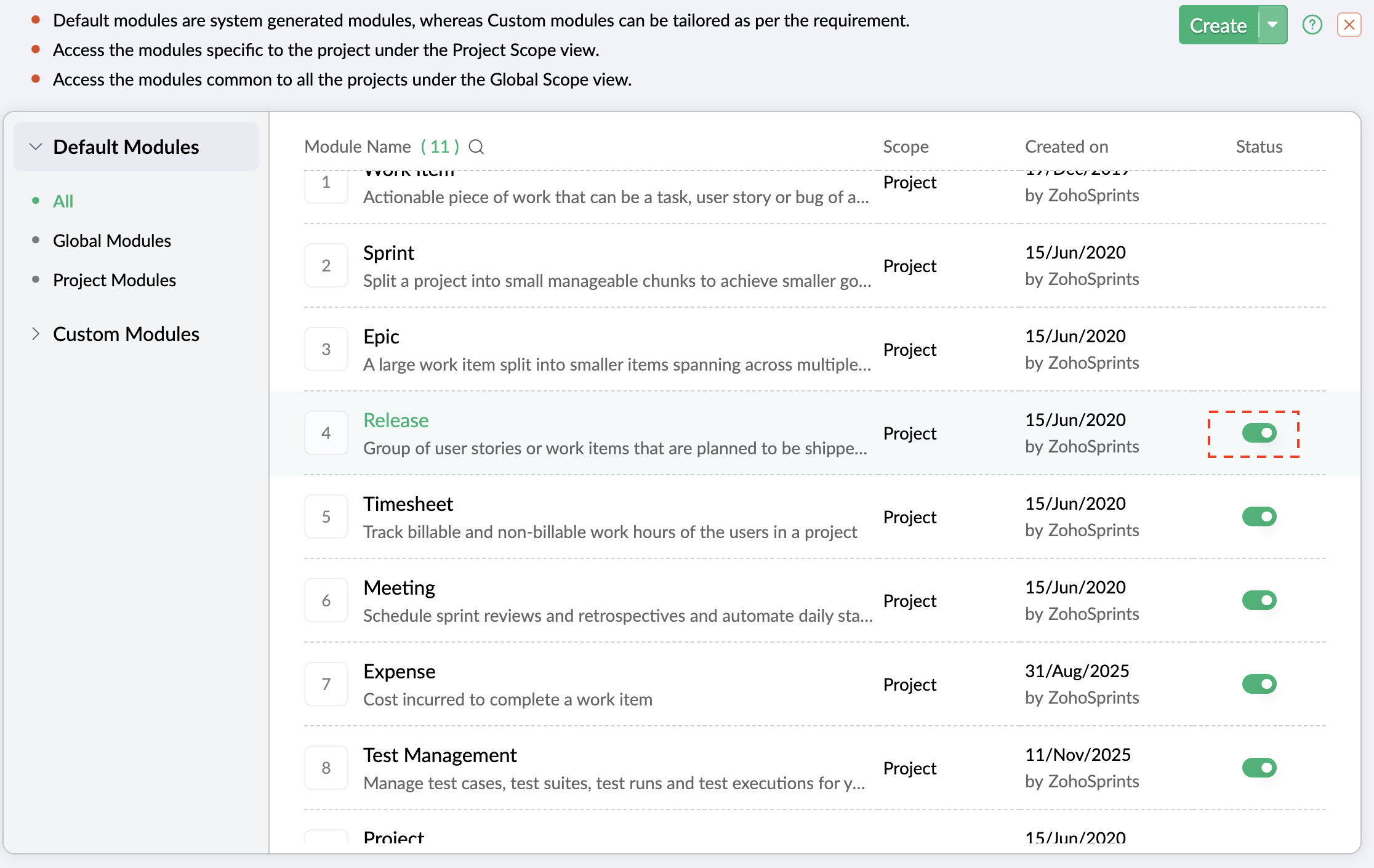 2. リリース、工数表、予定、経費、テスト管理は、要件に応じて有効化または無効化できます。