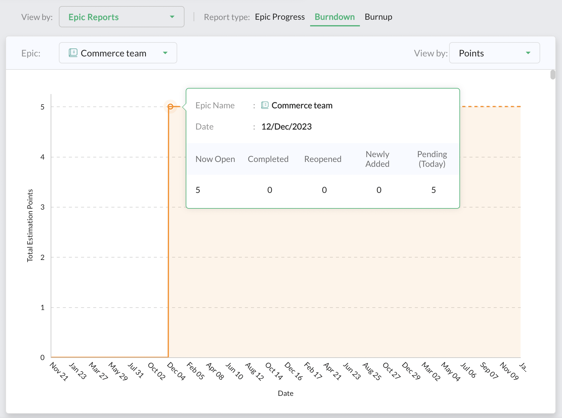 epic burndownレポートは、作業商品の件数またはポイントの残数を日ごとに表示します。このレポートを利用して、epicの進捗状況を毎日追跡し、予測されるepicの終了日を確認できます。