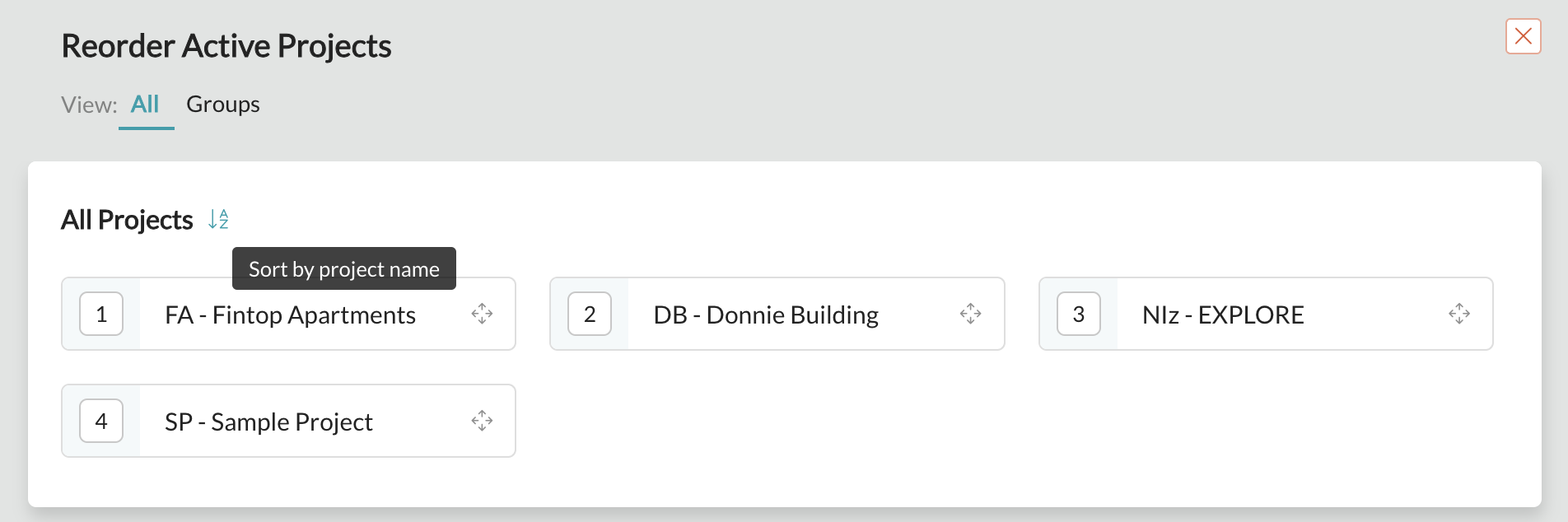 5. 並べ替えアイコンをクリックします。プロジェクトがアルファベット順に並べ替えられます。