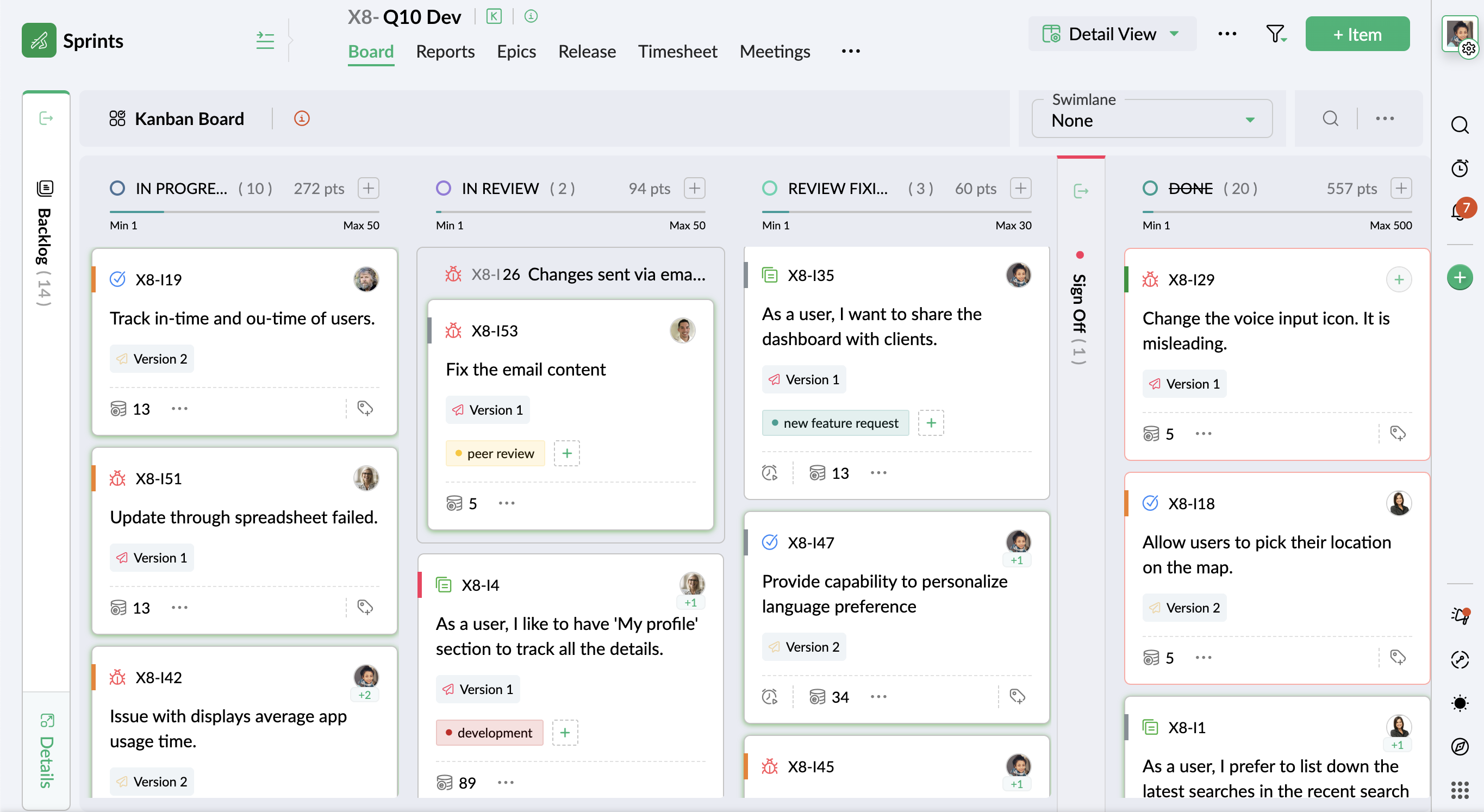 チームの日次・週次の活動はKanbanボード上で計画・予約できます。ボードは、すべての作業商品の状況を俯瞰できるビューを提供します。この共有ビューにより、チームは作業量を見積もり、キュー内の商品の優先順位を決定できます。