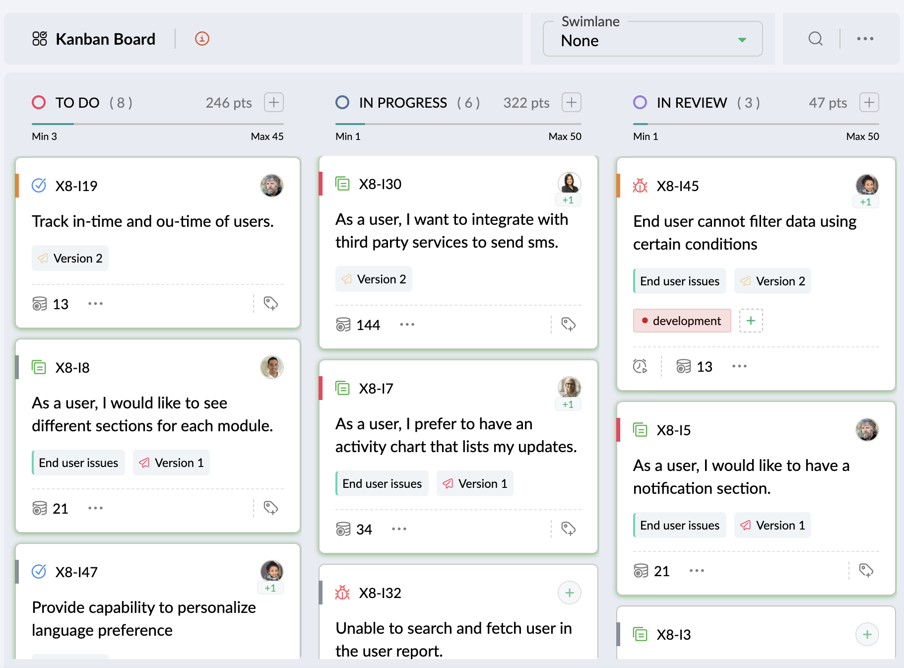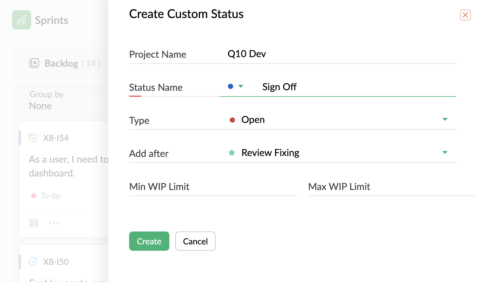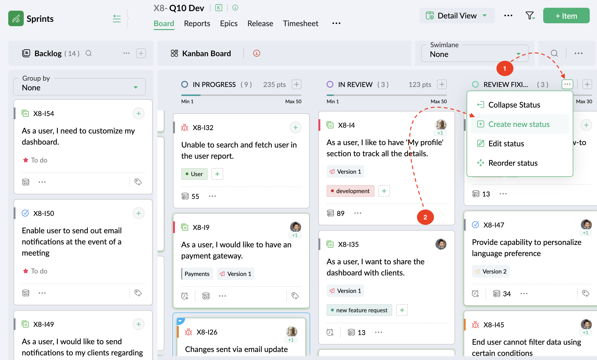 多くの企業には独自の要件があり、プロジェクトプロセスにさまざまな段階が含まれる場合があります。こうした要件に対応するため、カンバンボードではカスタムステータス機能を備えており、好みに応じて追加でステータスを設定できます。詳細はこちら