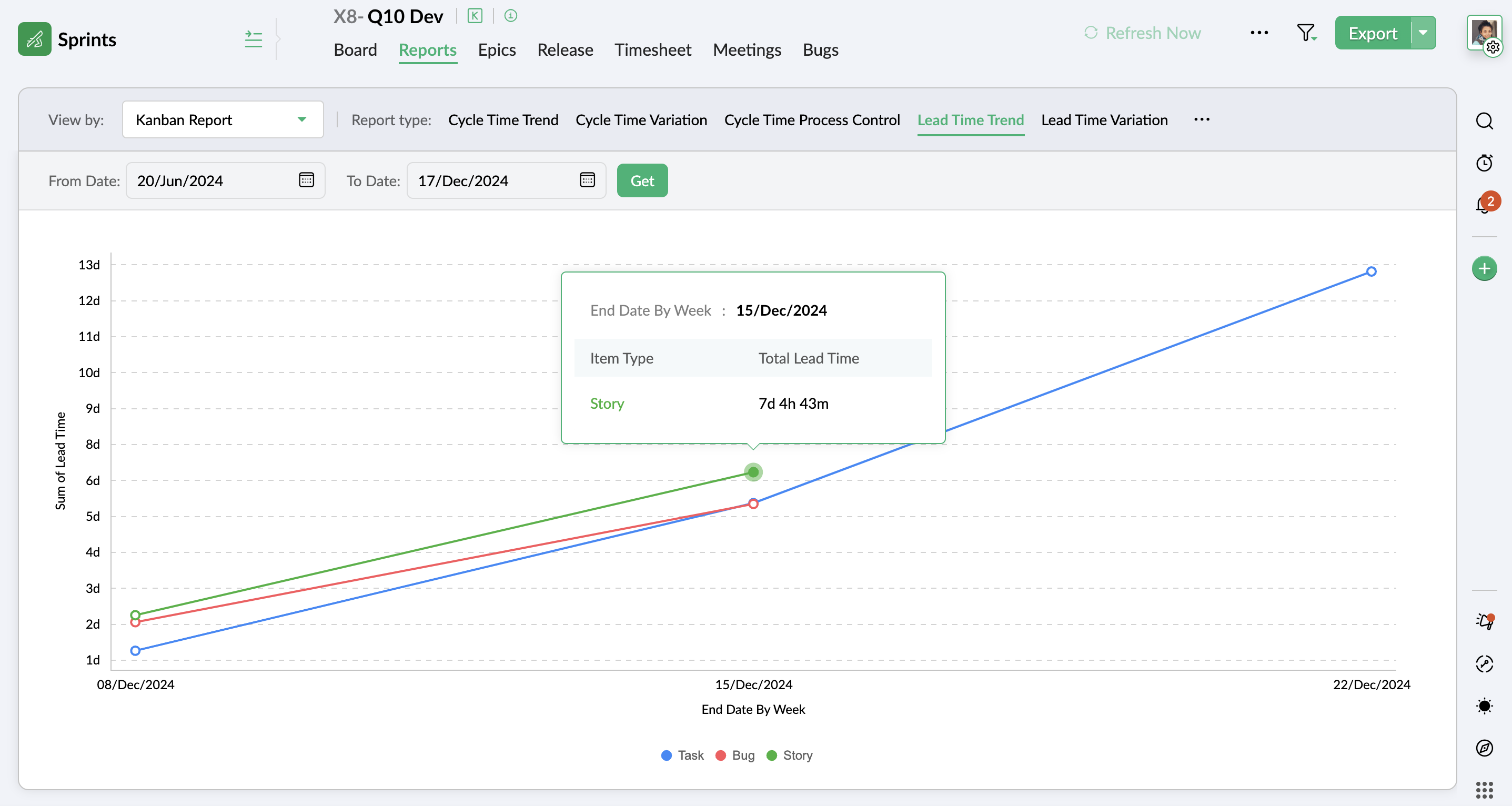 Lead 時間は、商品がボードに追加または移動されてから完了するまでの期間を指します。Zoho Sprints の Kanban レポートでは、このメトリックを使ってボード上のタスクに対して実施された作業にかかった時間を測定します。詳細はこちら