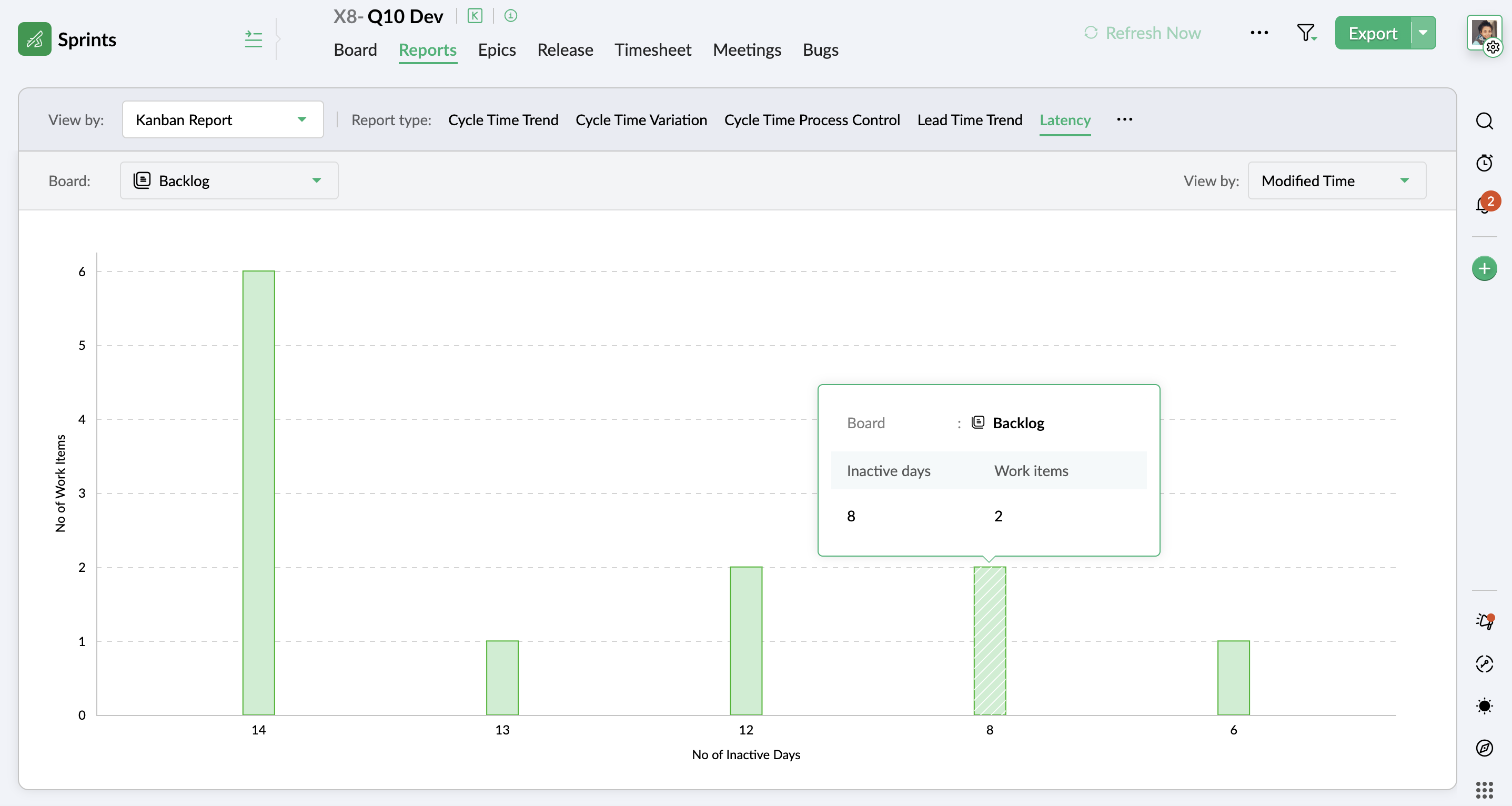 Latencyは、作業商品における活動や更新が行われていない状態を指します。このレポートでは、バックログまたはボード上の作業商品の無効日合計数を追跡できます。