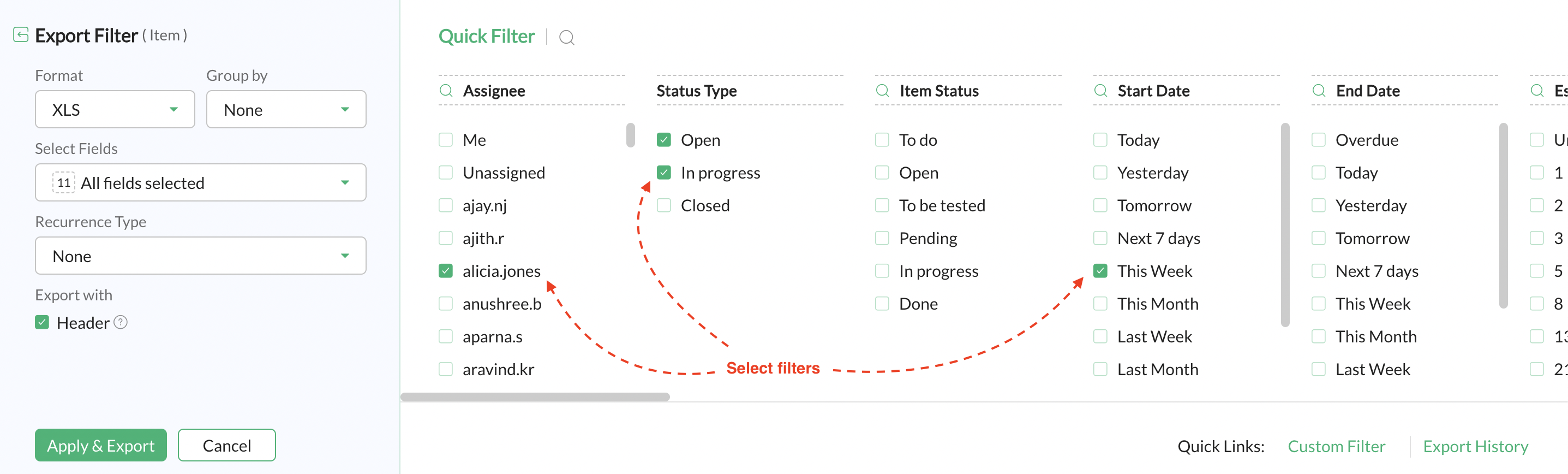 1. エクスポートするデータを選択するためにフィルターを適用できます。