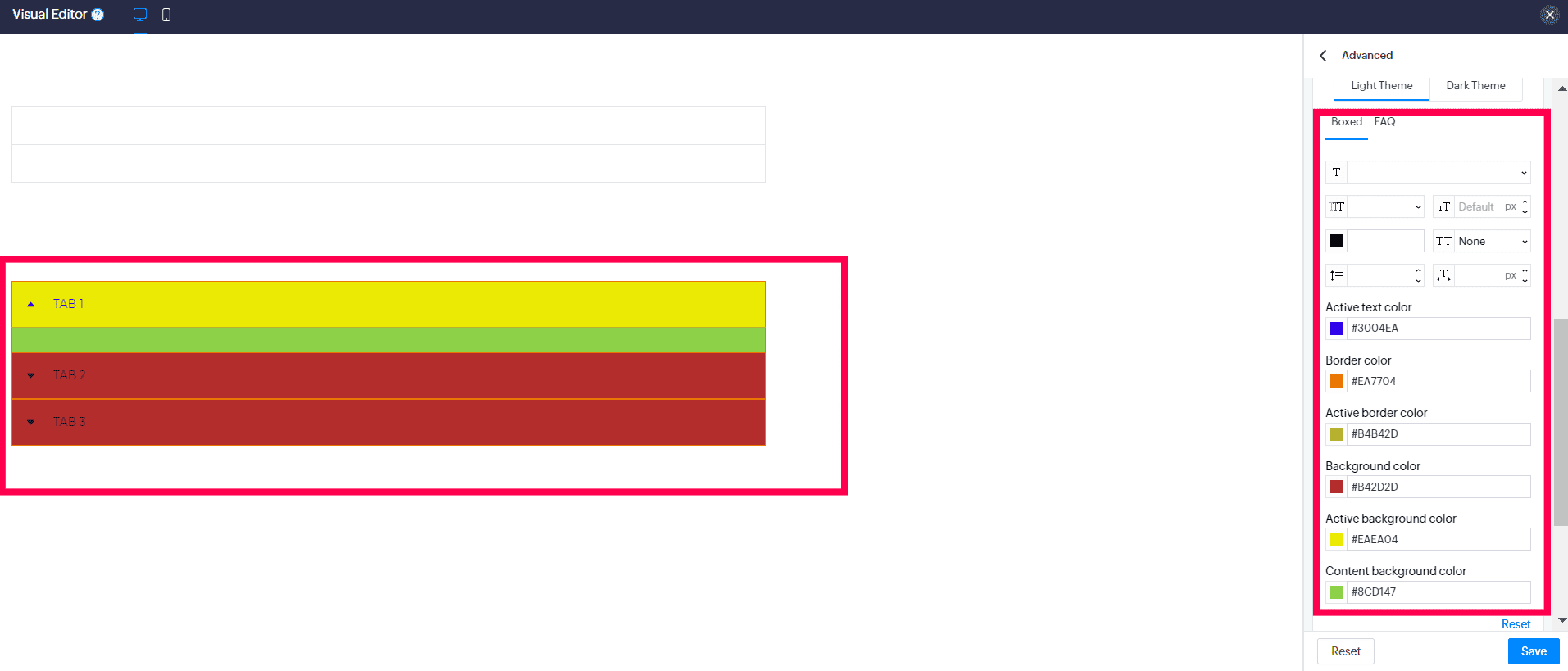 同様に、完了アコーディオンメニュー(すべてのタブを含む)の枠線色や背景色、および各アコーディオンの下に表示される回答部分の色も変更できます。変更するには、枠線色、背景色、およびコンテンツ背景色をそれぞれクリックしてください。
