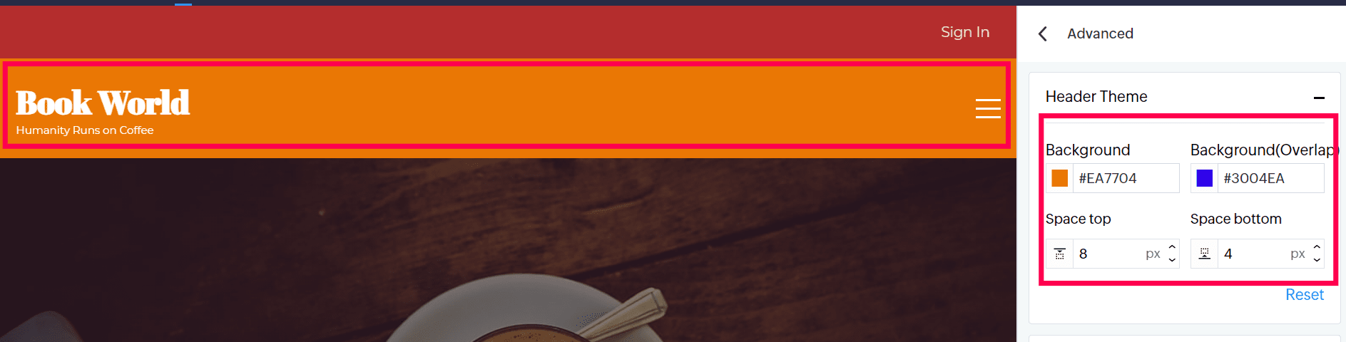 3. ここで、ヘッダーテーマの背景色を変更できます。また、お好みの重ね背景色を追加することも可能です。ヘッダーテーマの上下の余白も増やせます。