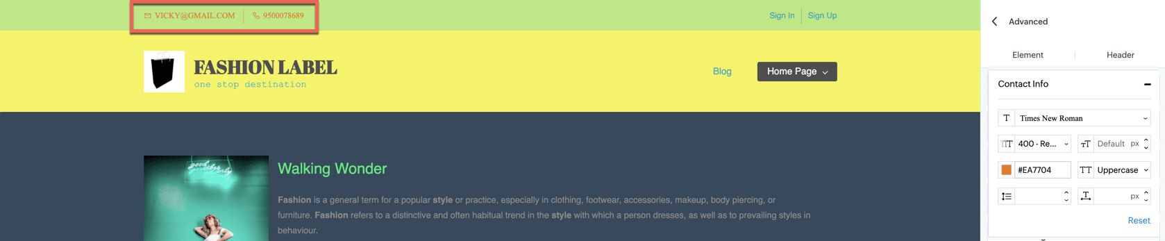 目立つ、かつアクセスしやすい連絡先フォームやボタンを設置することで、ユーザー体験やコンバージョン率を大幅に向上させることができます。訪問者が簡単に連絡できるようにすることで、フィードバックを大切にし、コミュニケーションを歓迎している姿勢を示せます。Zoho Sites では、この重要な情報をトップの棒グラフに表示できます(Configuration → Site 設定 → 連絡先 Information)。詳細 Visual Editor でこの内容を編集できます。