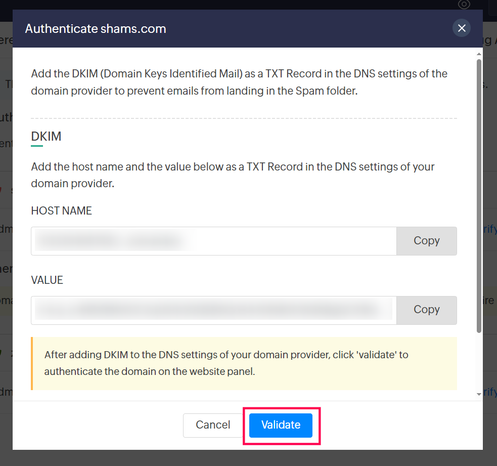 1. ホスト名と値の両方をコピーし、DNS設定でドメインプロバイダーにtxtデータとして貼り付けてください。