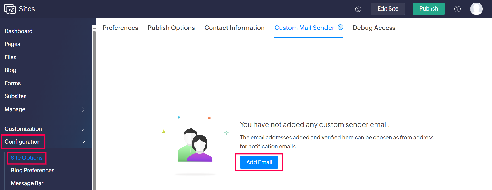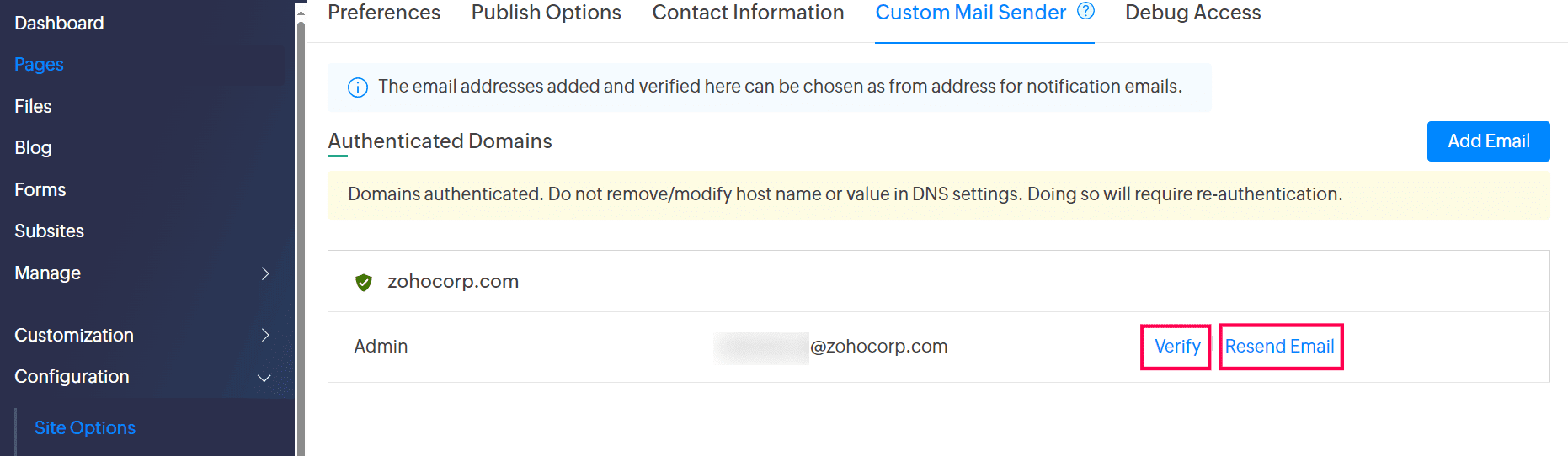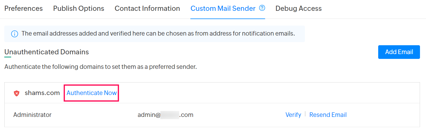 2. カスタム メール Senderを選択します。メールアドレスが認証されている場合は、Authenticated Domainsに表示されます。