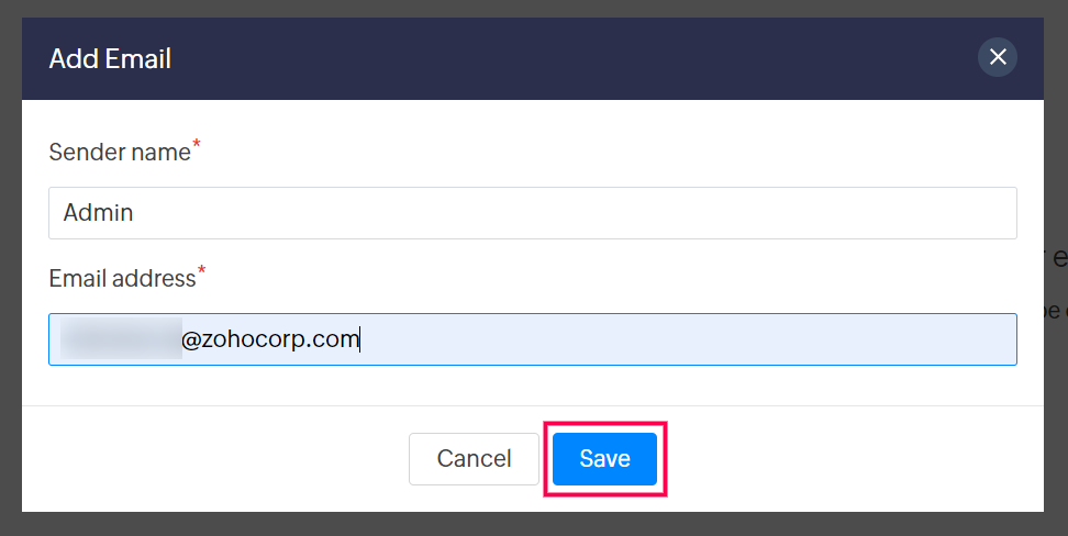 4. ポップアップ内でSender 名前メールアドレスを追加します。保存をクリックします。
