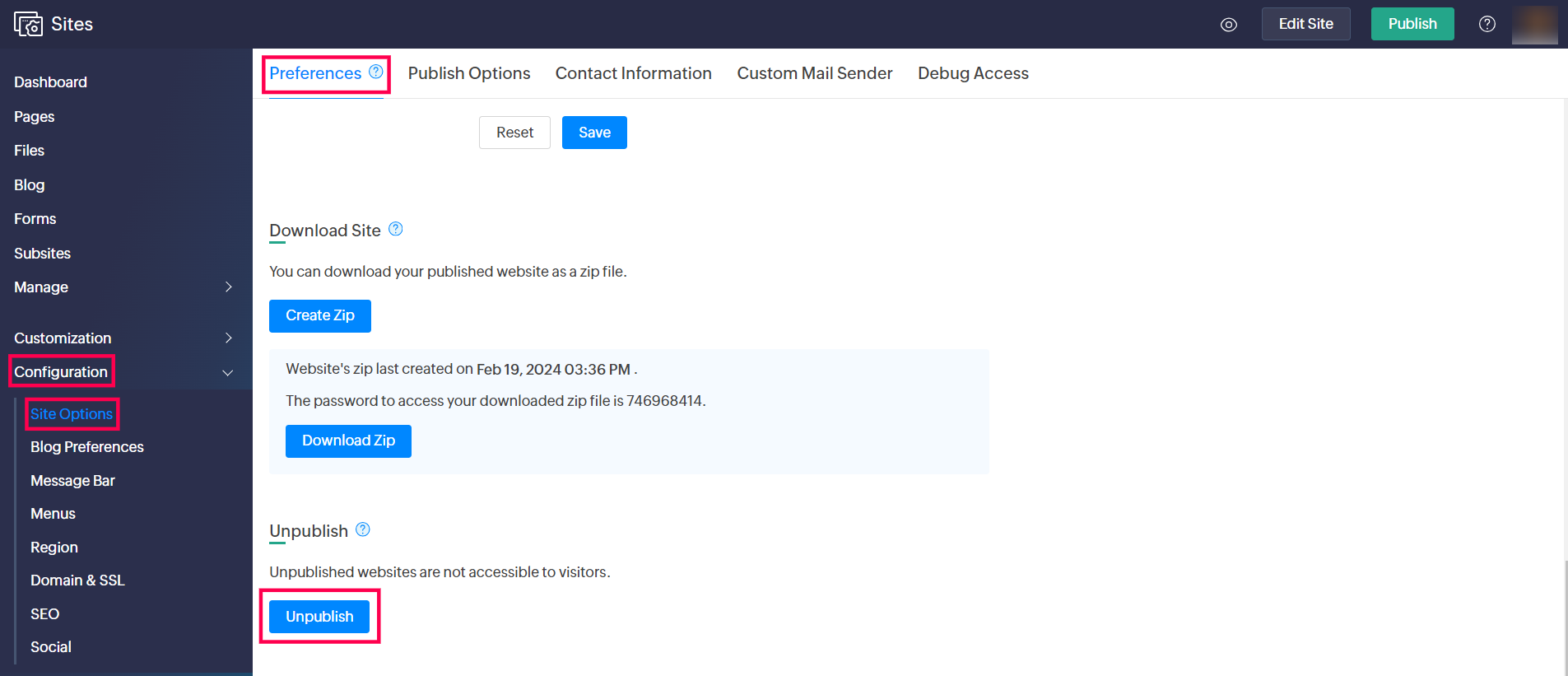 Configuration -> Site 設定に移動します。
