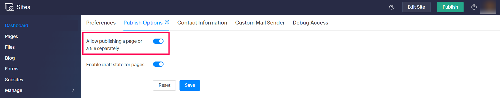 2. ページやファイルを個別に出版を許可を有効にすると、サイト全体を一度に公開するのではなく、各ページやファイルを個別に公開できます。保存をクリックします。